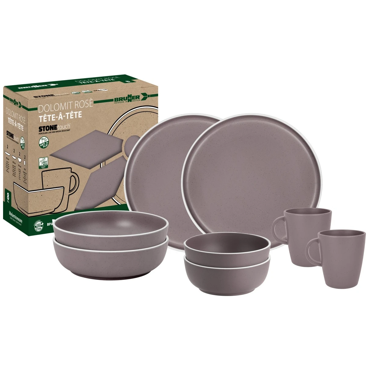 A Dolomit Set tete-a-tete a Brunner cégtől tartalmazza az alapvető kempingfelszerelést. A készlet 8 darabból áll, és 2 személy számára alkalmas. A melamin fokozott tartósságot biztosít az edényeknek. Ez az anyag ütésálló, könnyen tisztítható, hő- és nedvességálló, nincs szaga sem íze, valamint környezetbarát is. Az edények a fagyasztóba és a mosogatógépbe is betehetők.