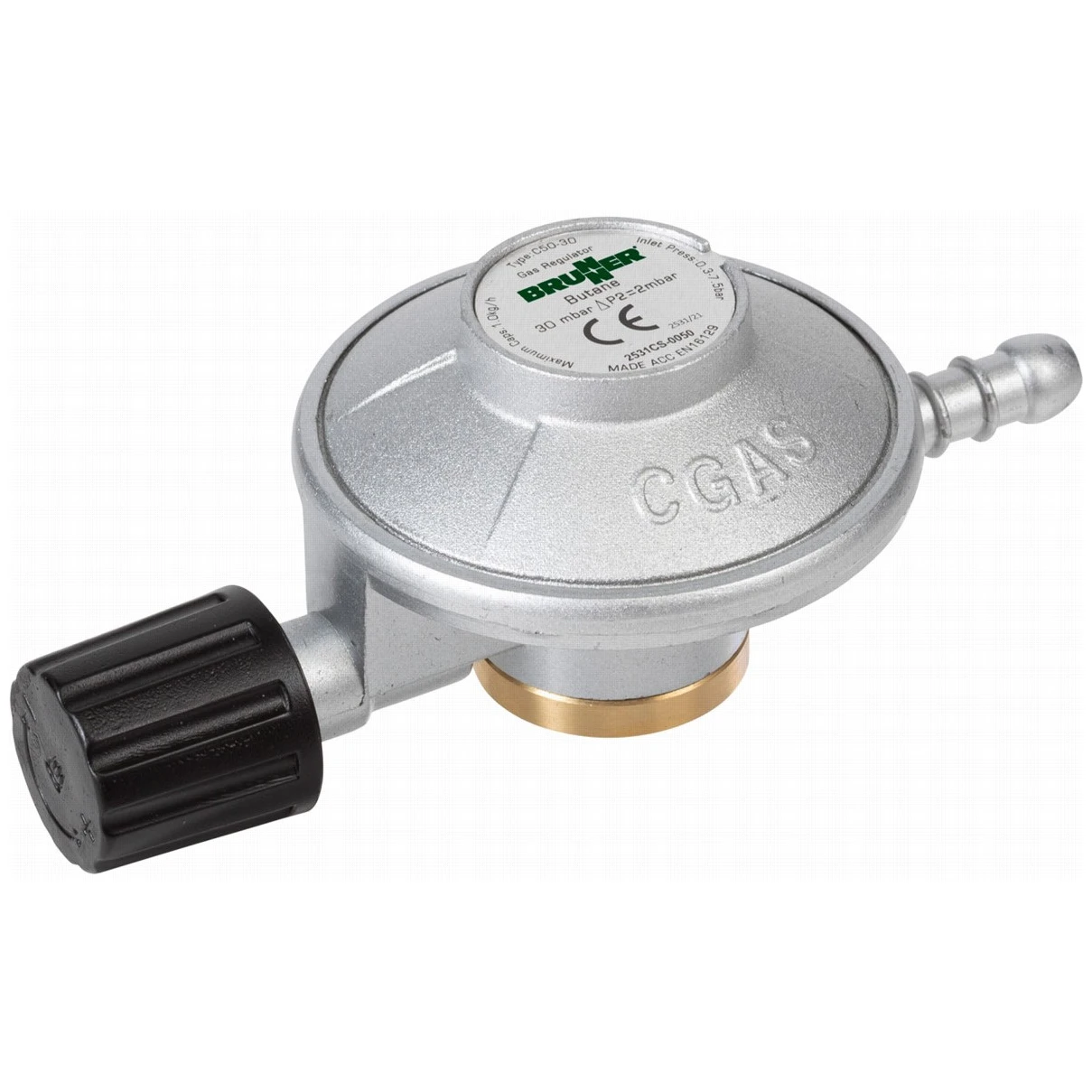 A Brunner márkájú Gasreg Cartridge 30 mbar szabályozó egység alkalmas alacsony nyomású gázfogyasztók ellátására EN417 menettel rendelkező gázpatronokkal, így kiküszöböli a nehéz gázpalackok szállításának szükségességét. Tartozék egy tömlő csatlakozó fúvókával (tömlő nélkül).