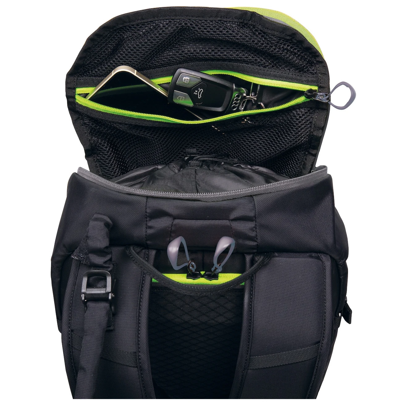 A hátizsákba egy nagy, cipzáras fedéllel, belső húzózsinórral és egy széles nyílással ellátott Full BackDoor segítségével juthatsz be. Belül található egy zseb a ivózsáknak és egy belső hálós zseb. A hátizsákhoz tartozik egy külön rekesz gyors hozzáféréssel. A rugalmas oldalzseb lehetővé teszi például a nedves dolgok tárolását.