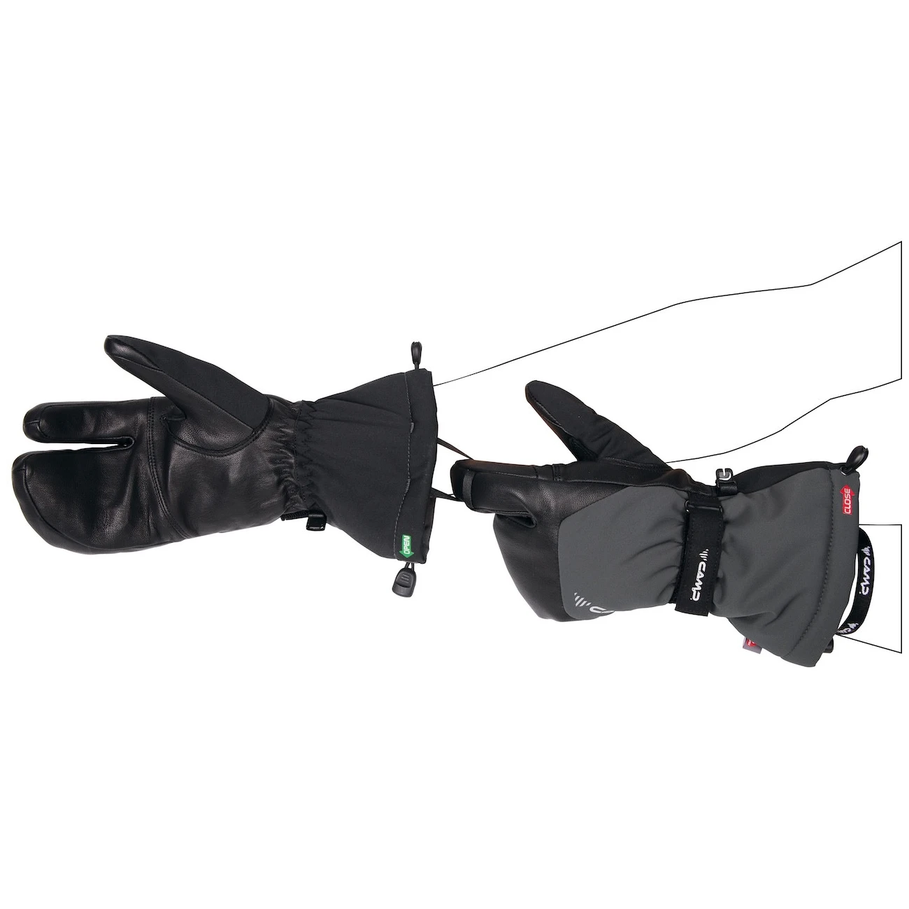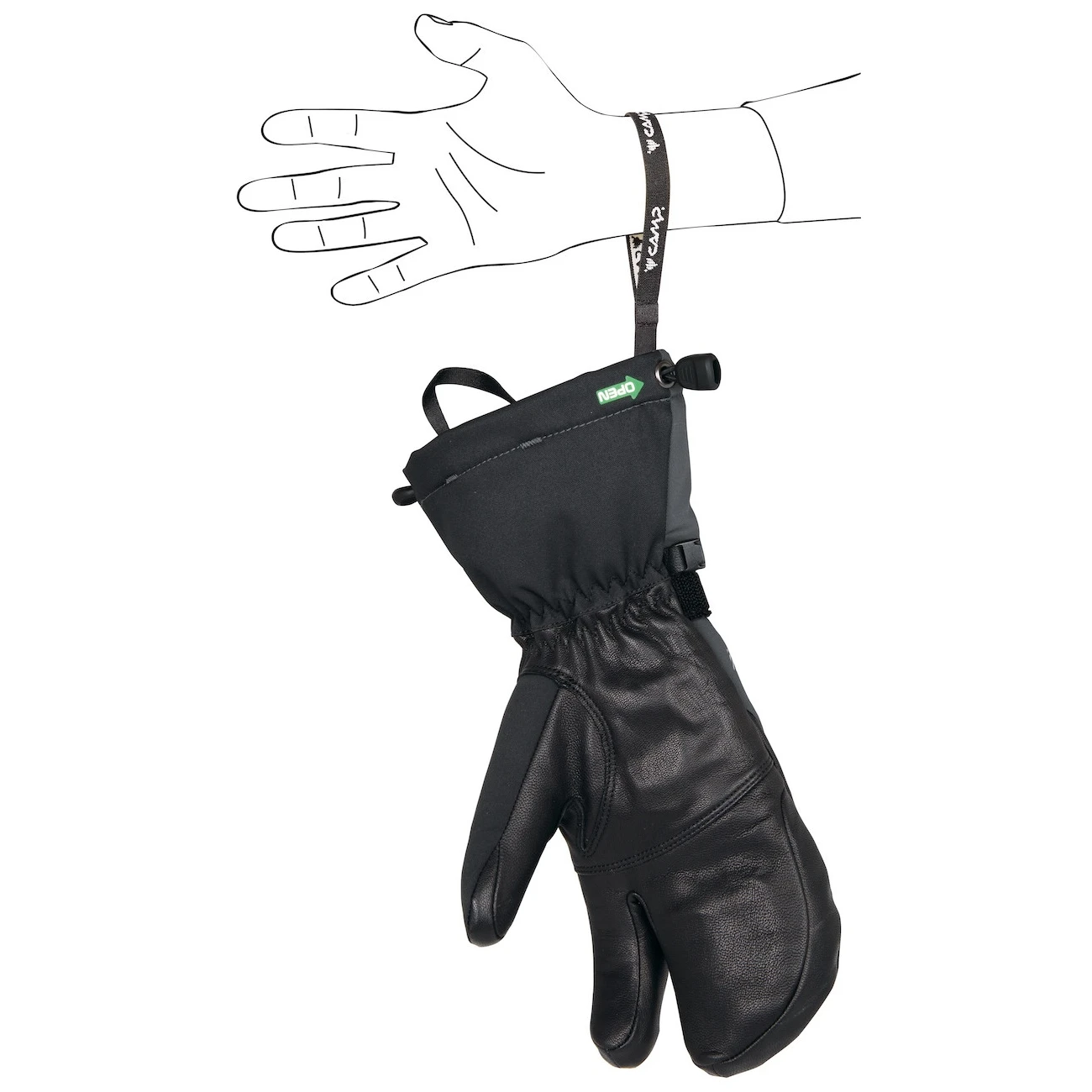 A kesztyű hosszított csuklórésszel rendelkezik, amely ráhúzható a kabátra, és elasztikus passzéval van ellátva. Az Open-Close rendszer javítja a hőszigetelést, és egy kézzel is kezelhető – a meghúzáshoz húzza meg a záró oldalt, a lazításhoz és a nyitáshoz pedig a nyitott oldalt.