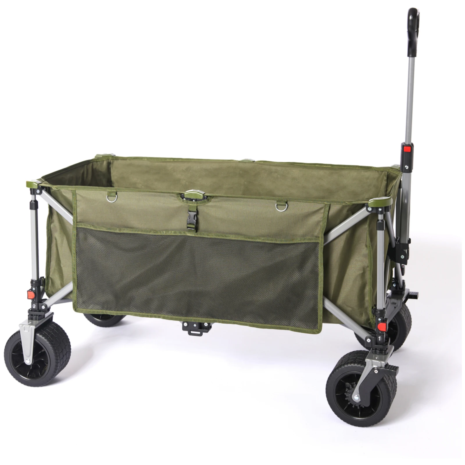 Az alkatrészek és a felszerelés áttekinthetősége és rendszerezése érdekében a kocsi beépített tárolóhellyel és mindkét oldalon extra zsebekkel rendelkezik. A hosszú, összecsukható fogantyú megkönnyíti a kocsi húzását még teljes terhelés mellett is. A széles, fékes kerekek jó terepjáró képességet biztosítanak, és egy gombnyomással eltávolíthatók, ami praktikus a szállítás és tárolás során.
