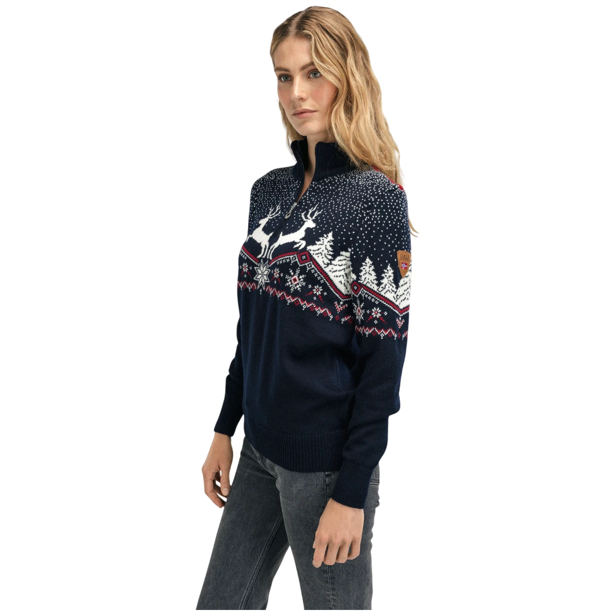 Klasszikus karácsonyi pulóver, a norvég karácsonyok ihletésével – rénszarvas, karácsonyfák, hulló hó – mindez egy helyen. És a pulóver közepén, mint egy karácsonyi csillag, emelkedik ki a hagyományos norvég nyolclevelű rózsa.