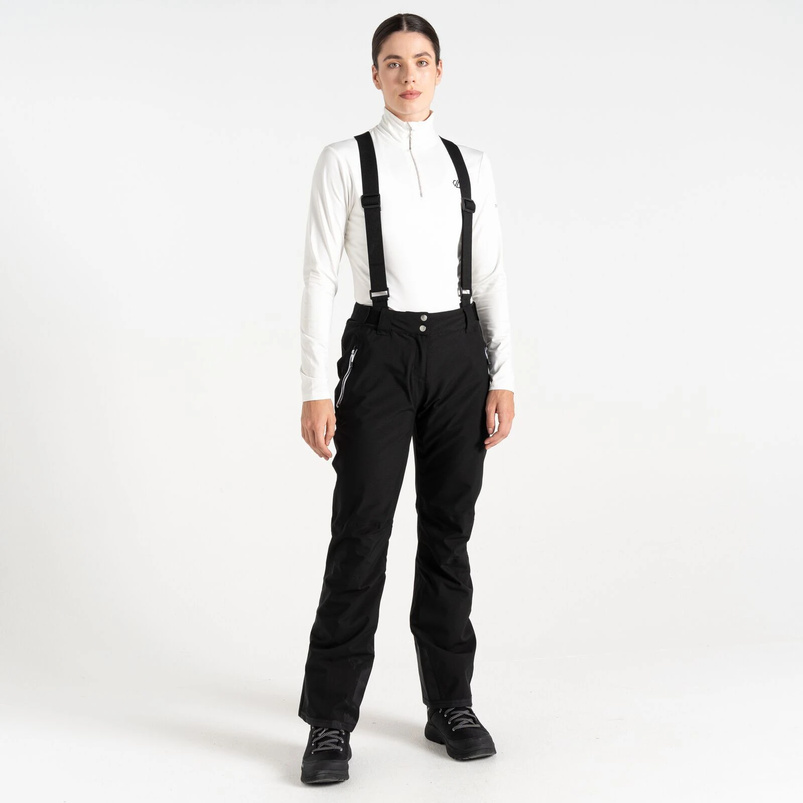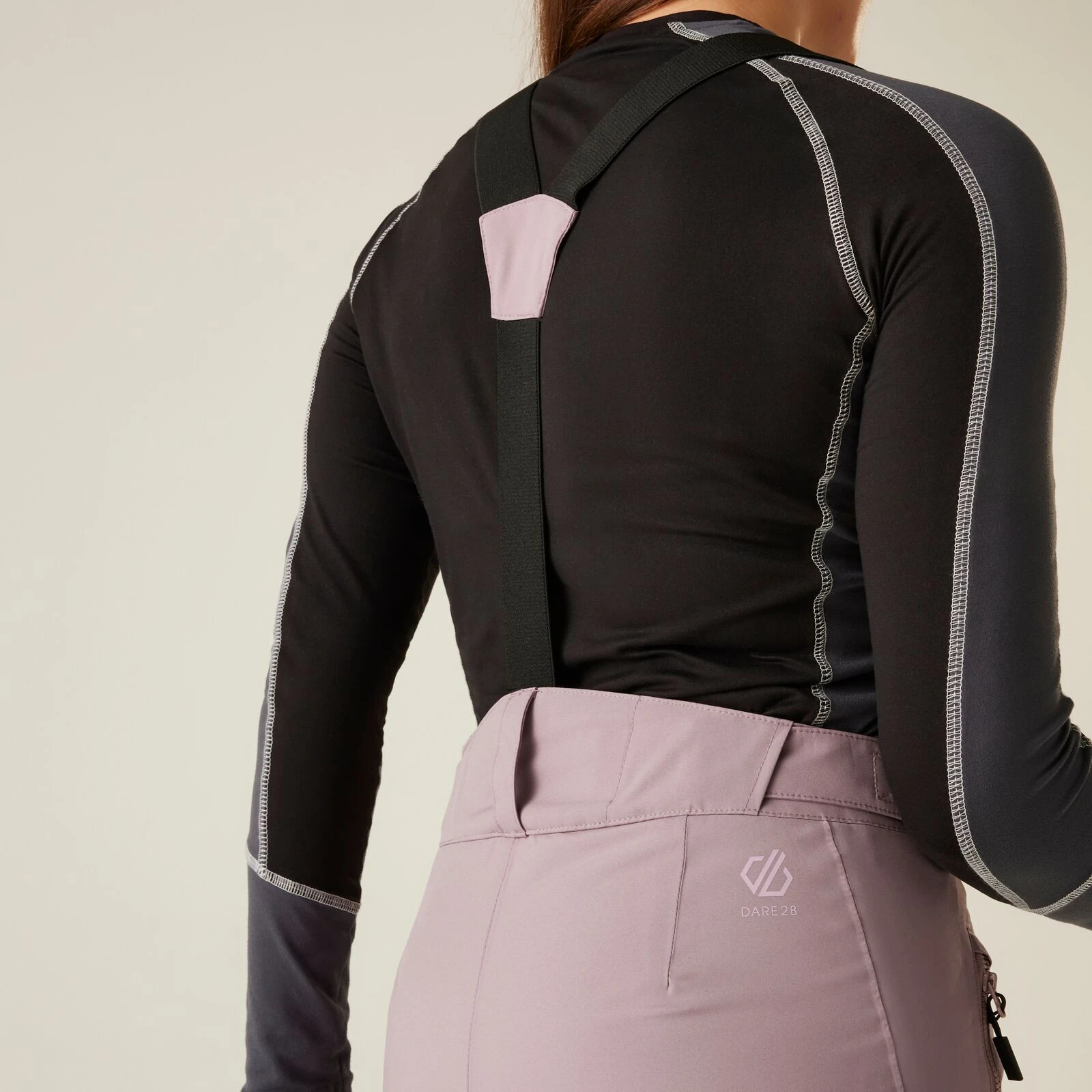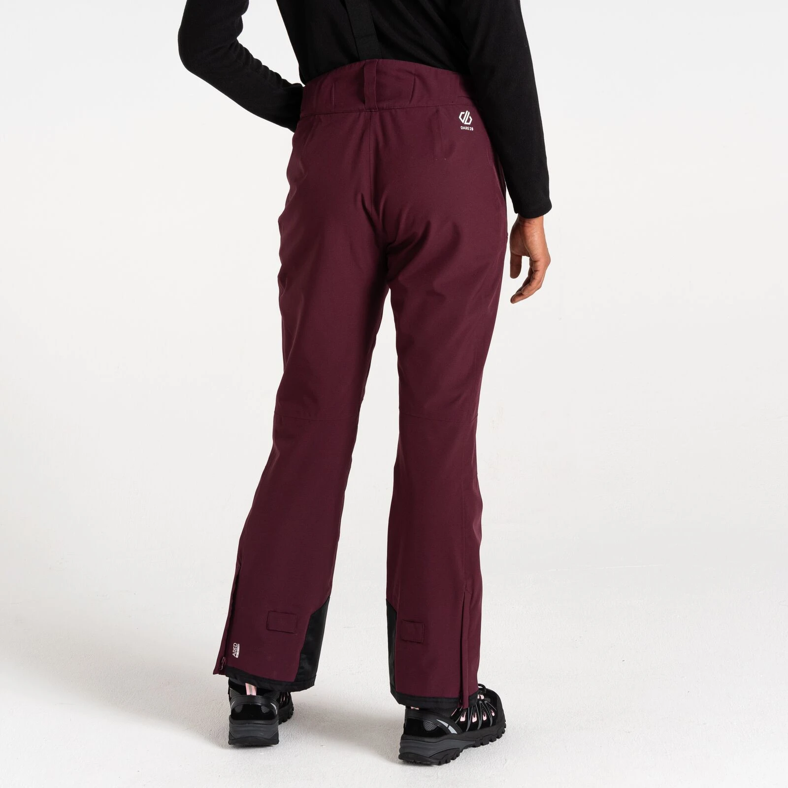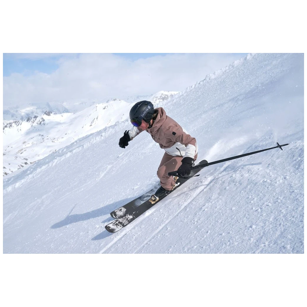 A Dare 2b márka Diminish Pant női sínadrágja klasszikus rögzítést, állítható, levehető kantárt, valamint a derék tépőzárral történő beállítását kínálja. A csuklós térdek jobb mozgásszabadságot biztosítanak. A ragasztott varratok nem engedik átázni az anyagot, valamint az anyag vízálló kivitelét. A nadrág a boka területén megerősített anyaggal van ellátva, a nadrág belsejében hófogó mandzsetta található. A lábak oldalán található cipzár megkönnyíti a sílécek felcsúsztatását.