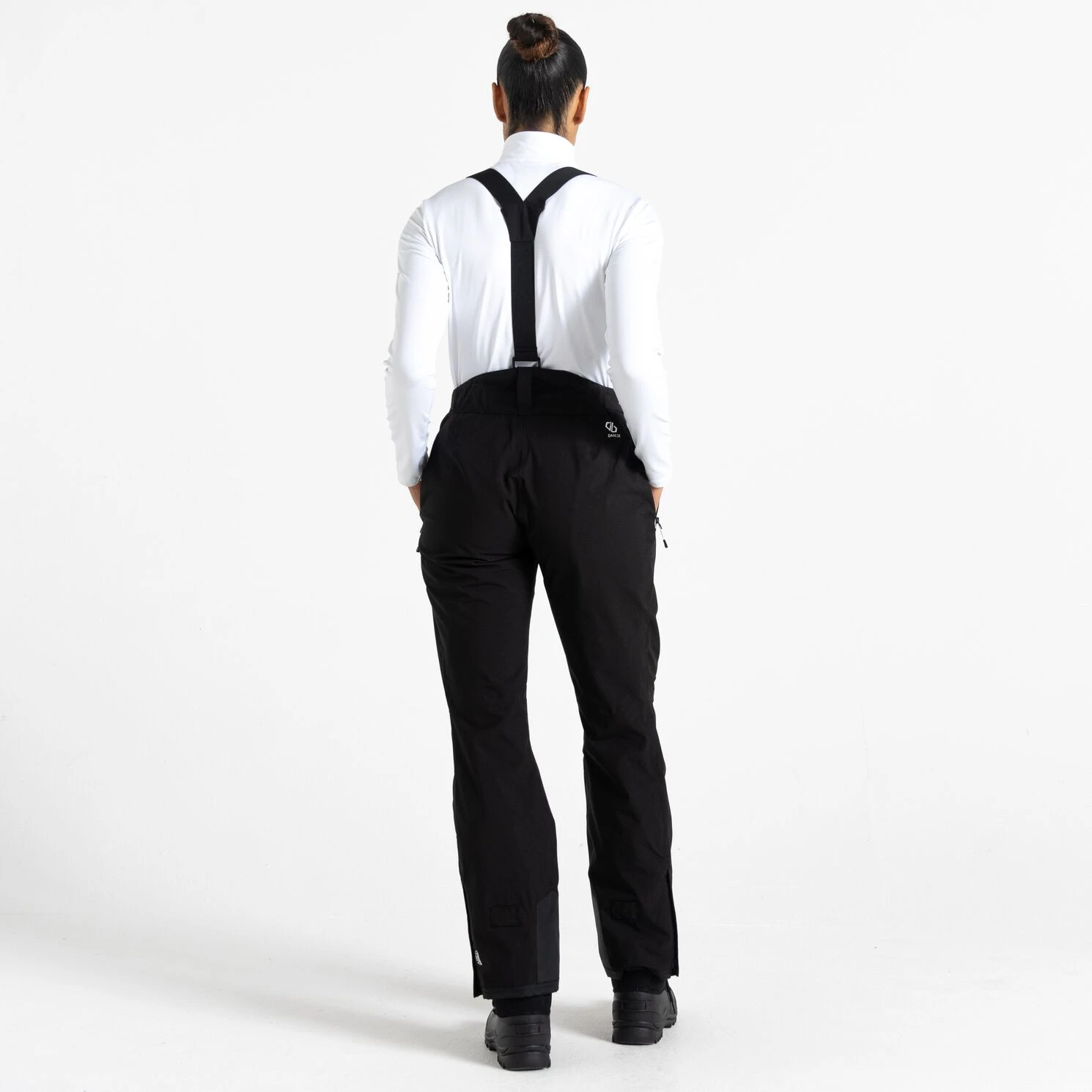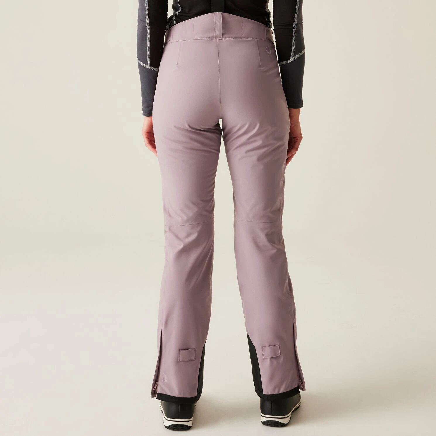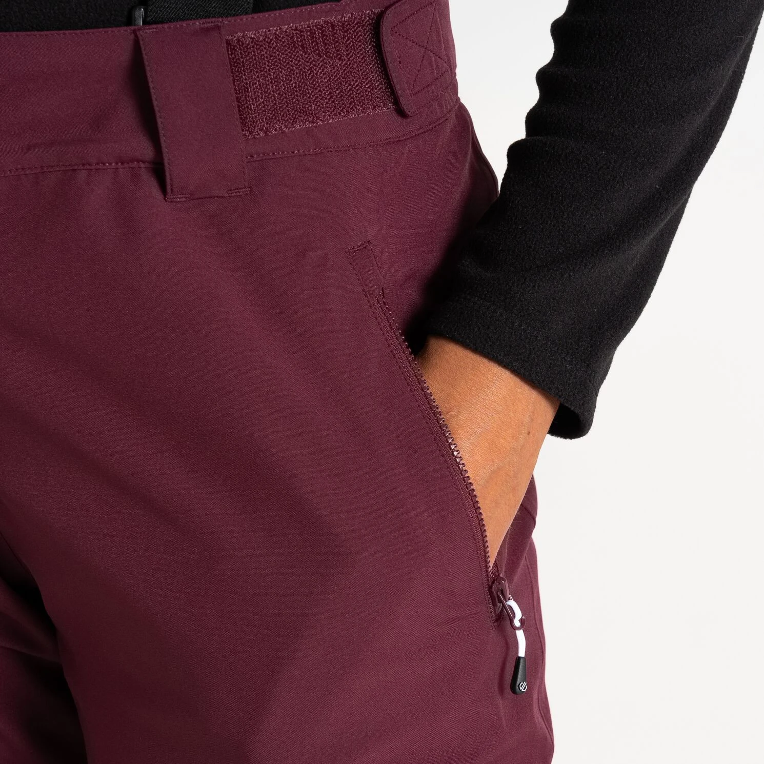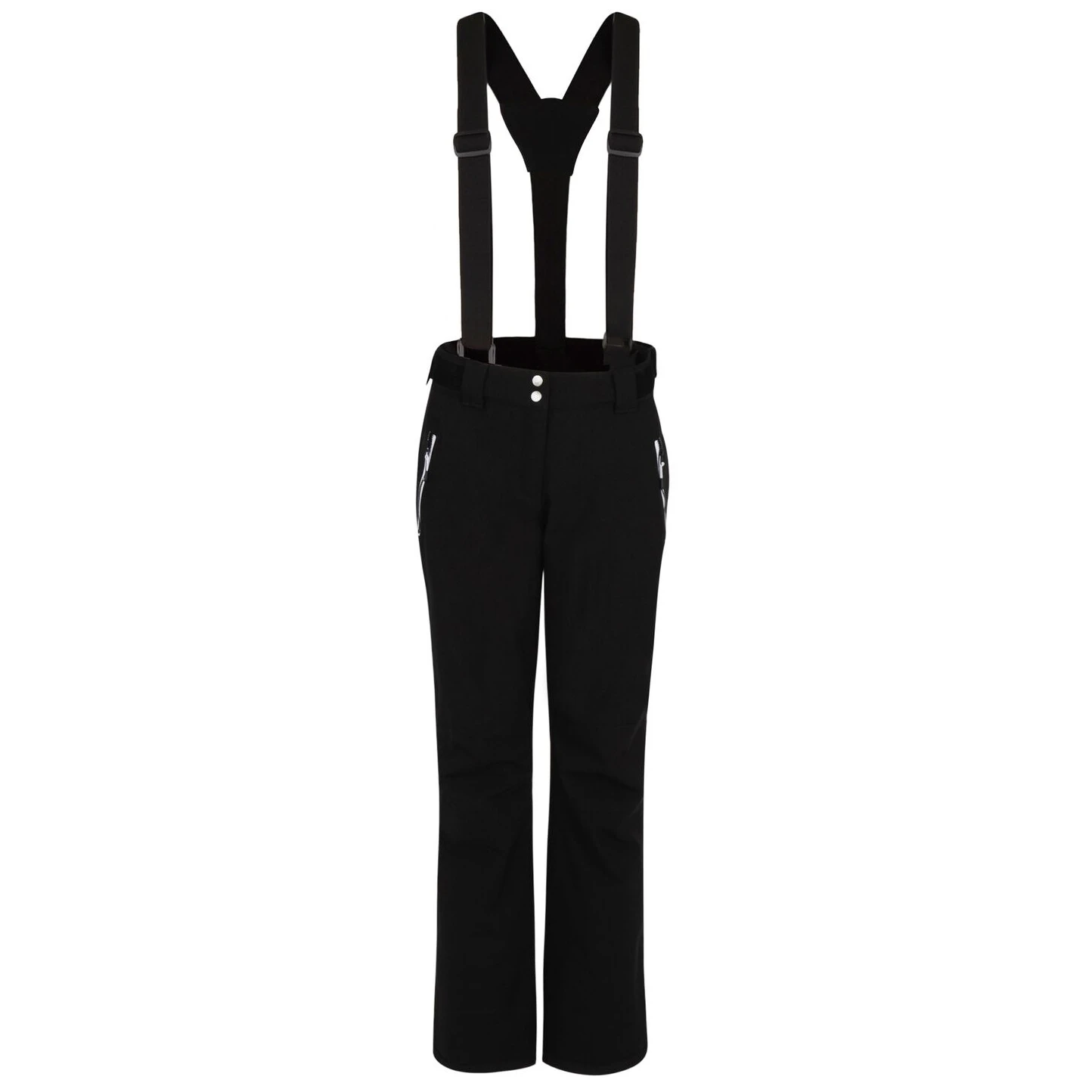 A Dare 2b márka Diminish Pant női sínadrágja klasszikus rögzítést, állítható, levehető kantárt, valamint a derék tépőzárral történő beállítását kínálja. A csuklós térdek jobb mozgásszabadságot biztosítanak. A ragasztott varratok nem engedik átázni az anyagot, valamint az anyag vízálló kivitelét. A nadrág a boka területén megerősített anyaggal van ellátva, a nadrág belsejében hófogó mandzsetta található. A lábak oldalán található cipzár megkönnyíti a sílécek felcsúsztatását.