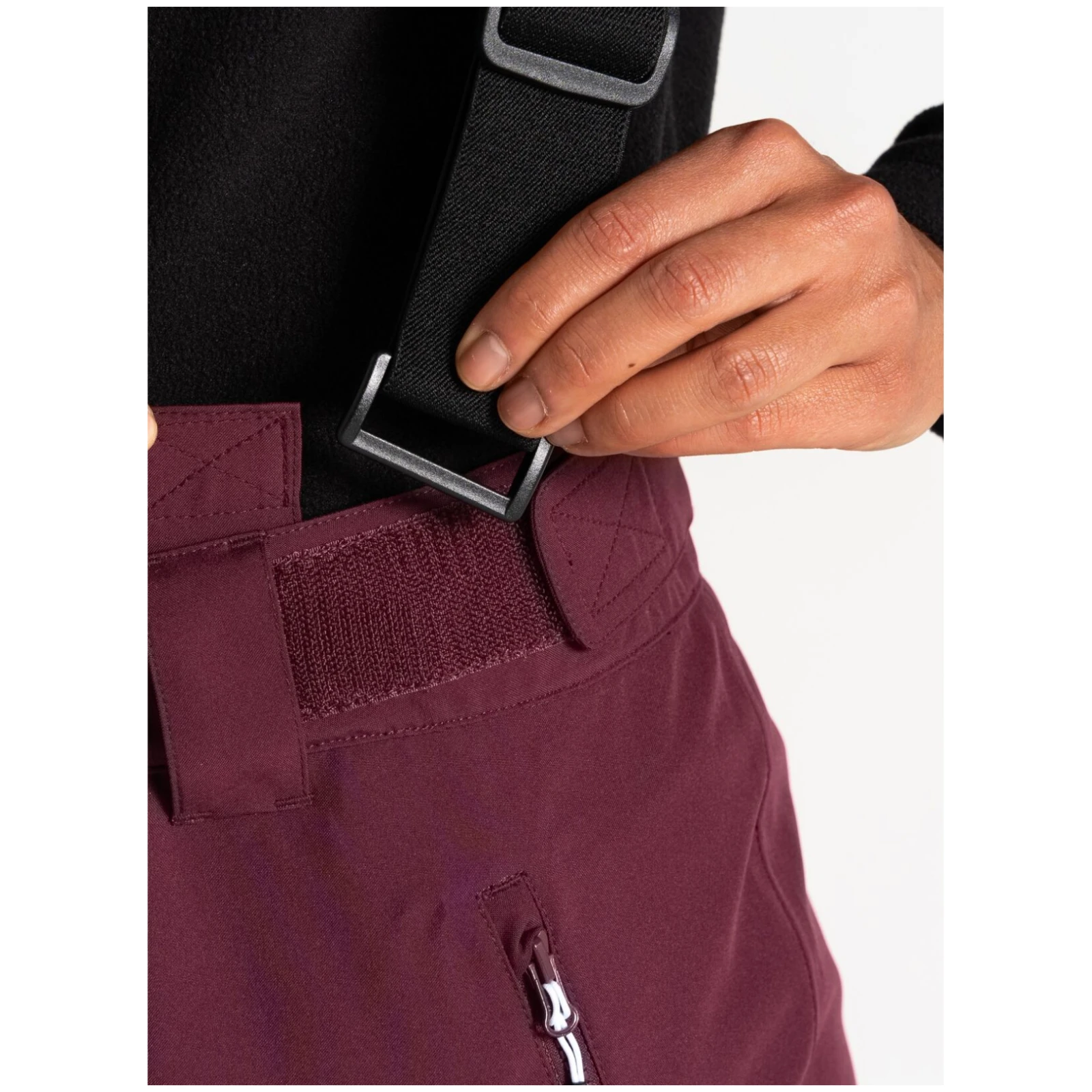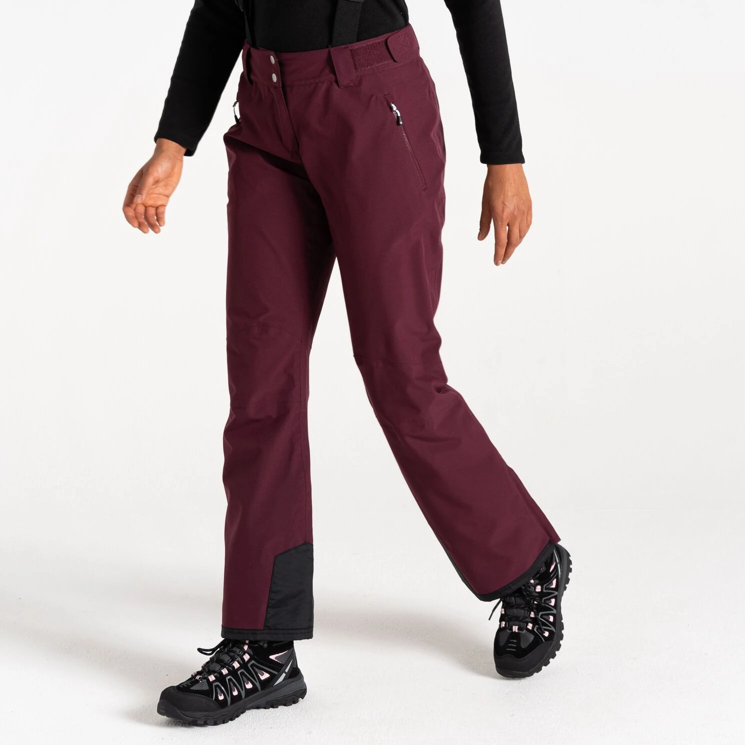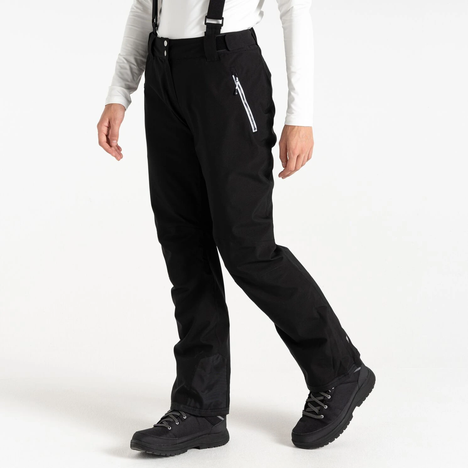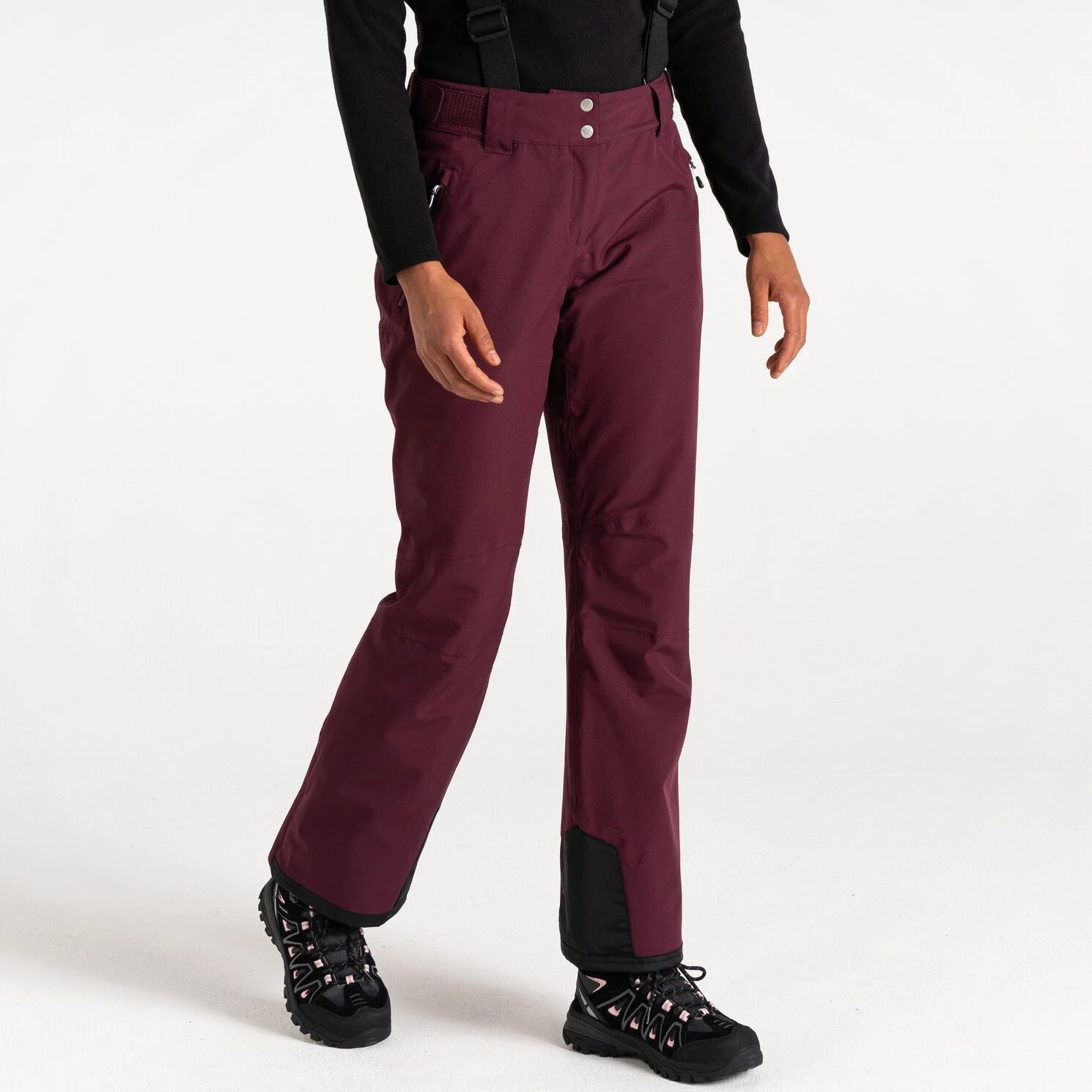 A Dare 2b márka Diminish Pant női sínadrágja klasszikus rögzítést, állítható, levehető kantárt, valamint a derék tépőzárral történő beállítását kínálja. A csuklós térdek jobb mozgásszabadságot biztosítanak. A ragasztott varratok nem engedik átázni az anyagot, valamint az anyag vízálló kivitelét. A nadrág a boka területén megerősített anyaggal van ellátva, a nadrág belsejében hófogó mandzsetta található. A lábak oldalán található cipzár megkönnyíti a sílécek felcsúsztatását.