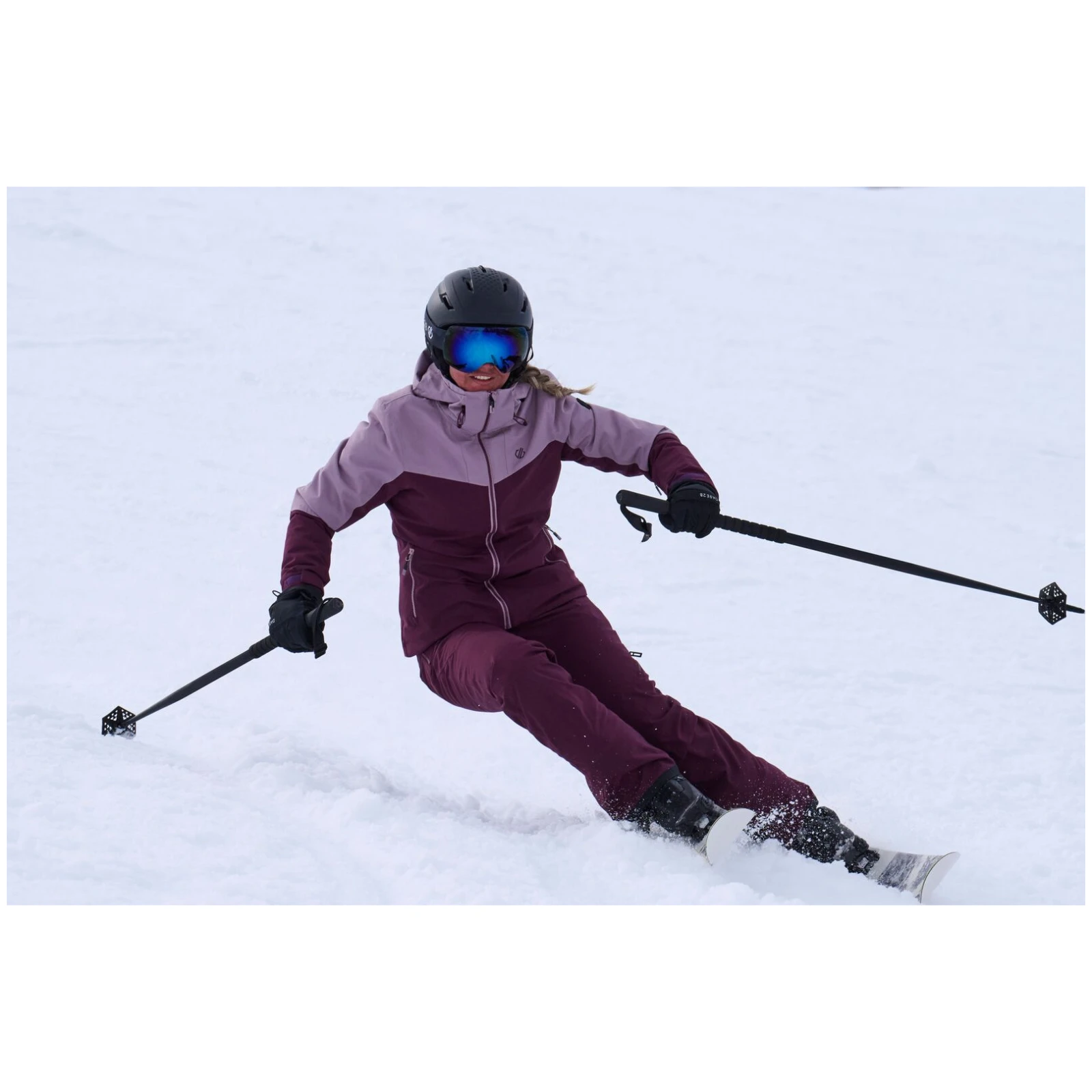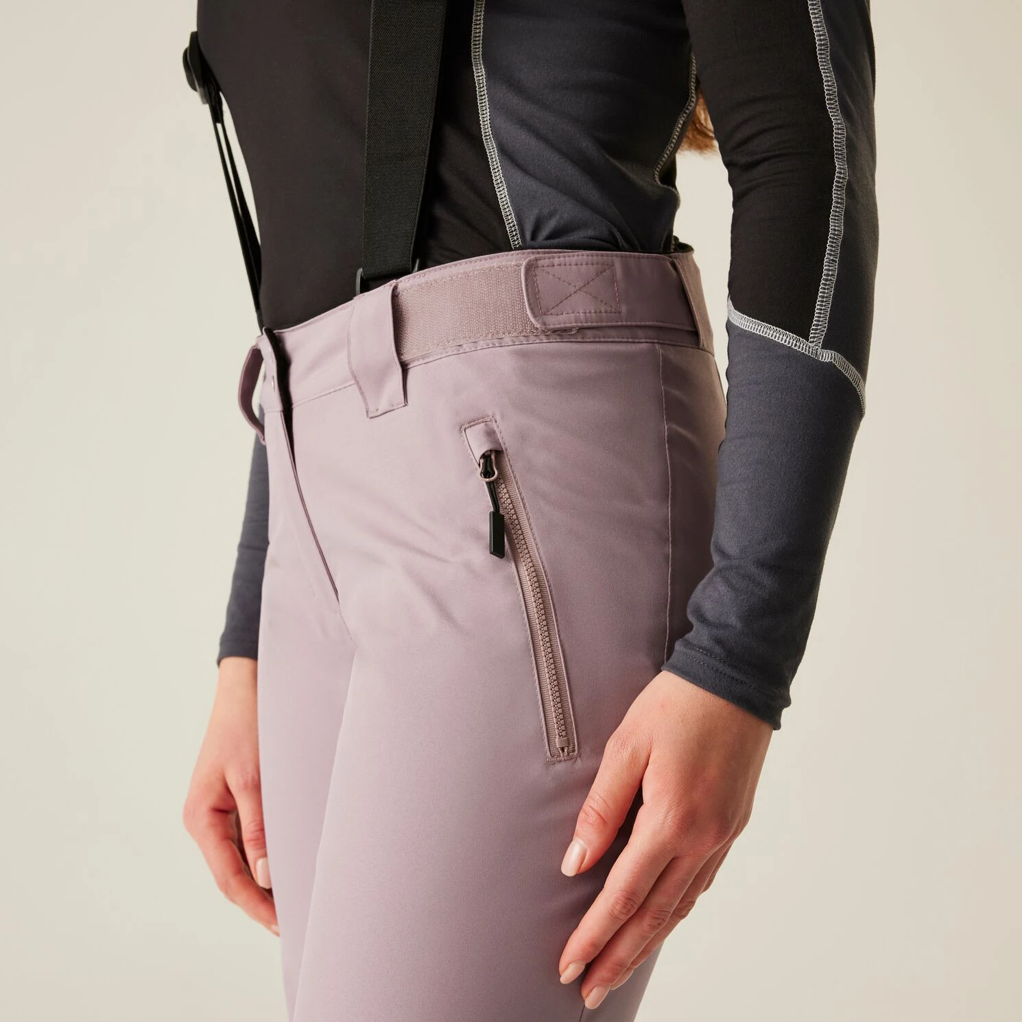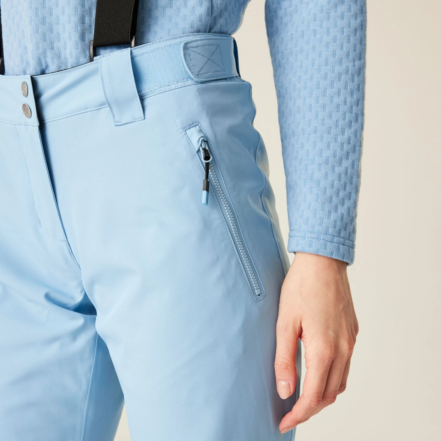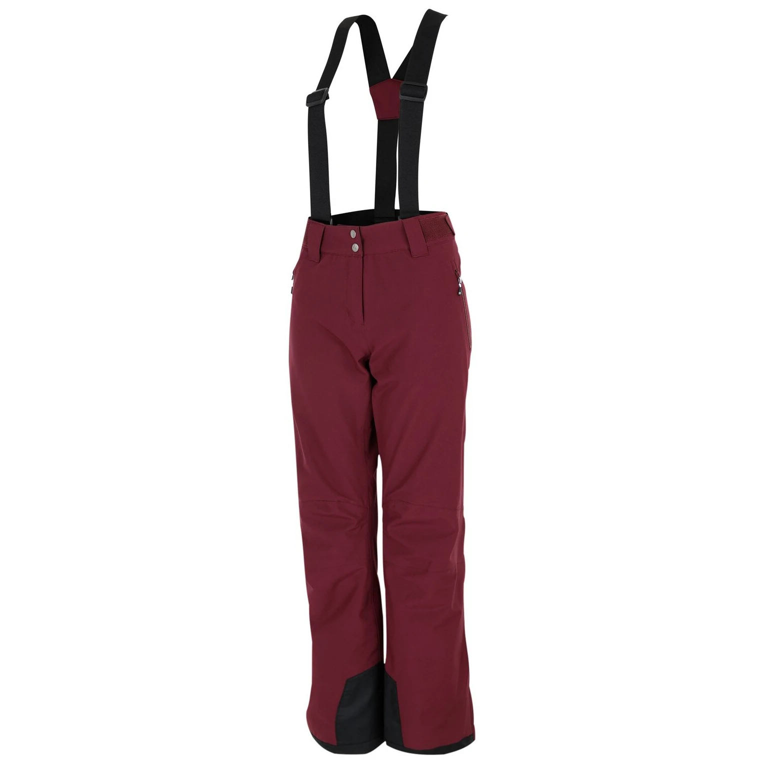 A Dare 2b márka Diminish Pant női sínadrágja klasszikus rögzítést, állítható, levehető kantárt, valamint a derék tépőzárral történő beállítását kínálja. A csuklós térdek jobb mozgásszabadságot biztosítanak. A ragasztott varratok nem engedik átázni az anyagot, valamint az anyag vízálló kivitelét. A nadrág a boka területén megerősített anyaggal van ellátva, a nadrág belsejében hófogó mandzsetta található. A lábak oldalán található cipzár megkönnyíti a sílécek felcsúsztatását.