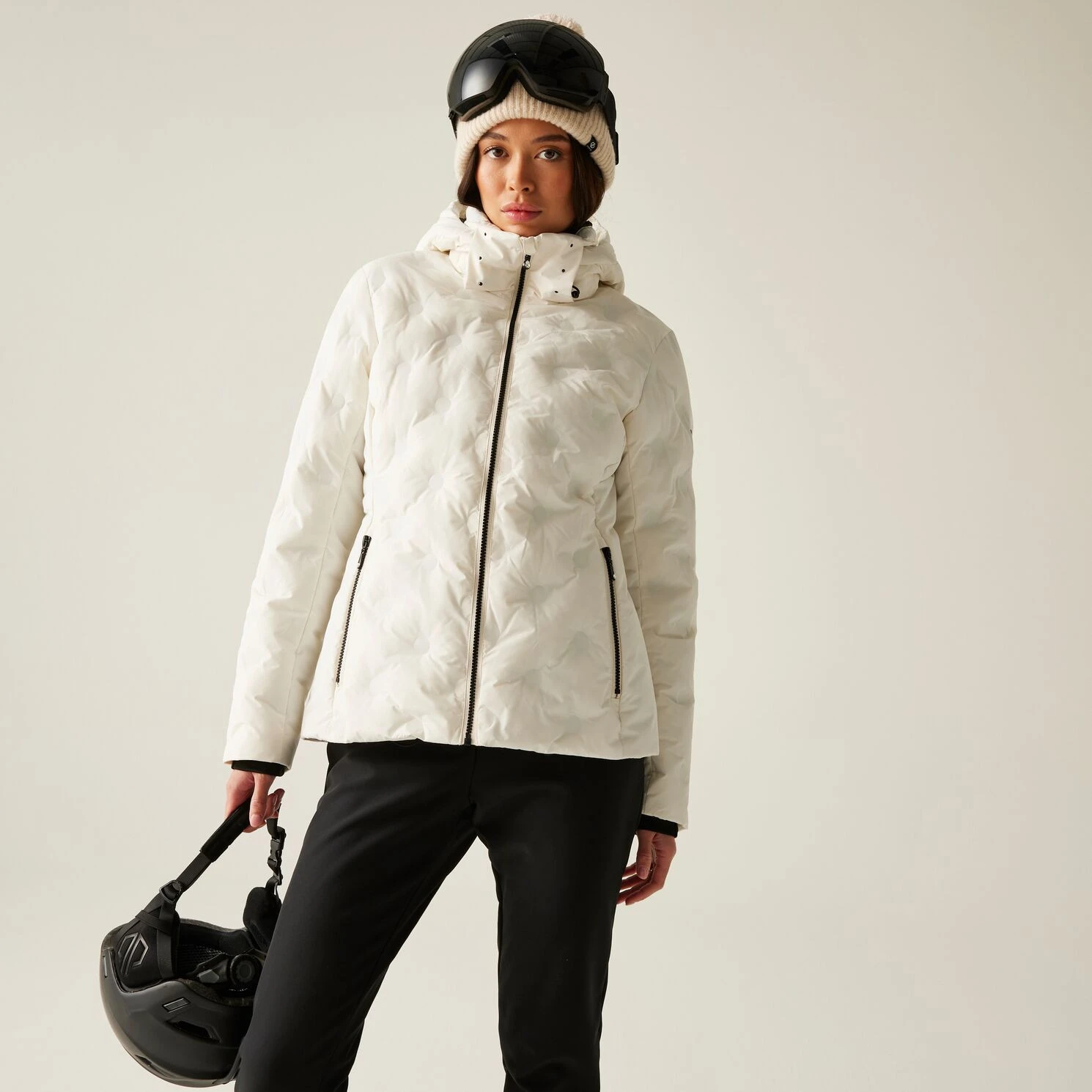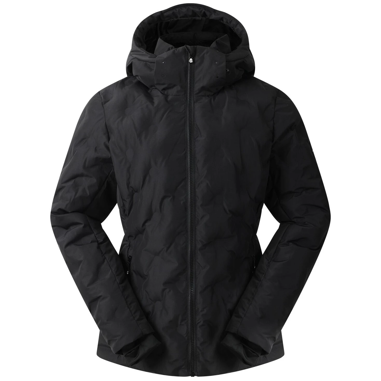 A kabát tartalmaz egy síbérlettartó zsebet, egy fix hófogót és egy levehető kapucnit állítható pántokkal. A hőzáró dizájnelem extra védelmet nyújt a szél és a hó ellen.