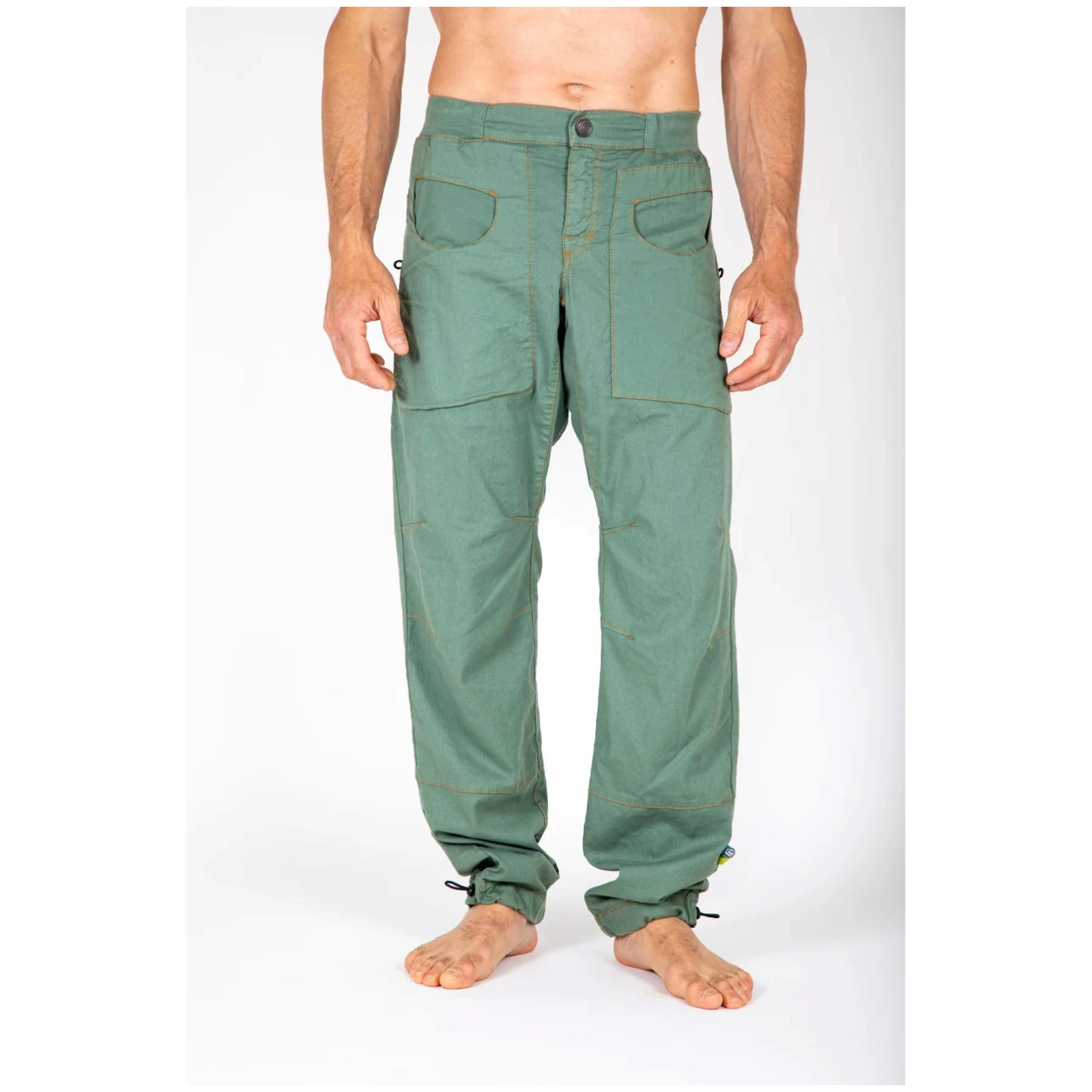 Modern, laza szabású férfi nadrág F-Blat2 Men's a E9 márkától 52% lenből, 46% organikus pamutból és 2% elasztánból készült. A nadrág elasztikus derékpánttal rendelkezik, zárral és övhurkokkal. Állítható alsó szárral és mindkét oldalon kefetartó hurkokkal rendelkezik. A zsebek kontrasztos kivitelűek (belül poplin anyagból). Olaszországban készültek, minimális környezetszennyezéssel, és a hangsúlyt az extravagáns kivitelezésre, az egyedi designra és a mászás közbeni kényelemre helyezik.