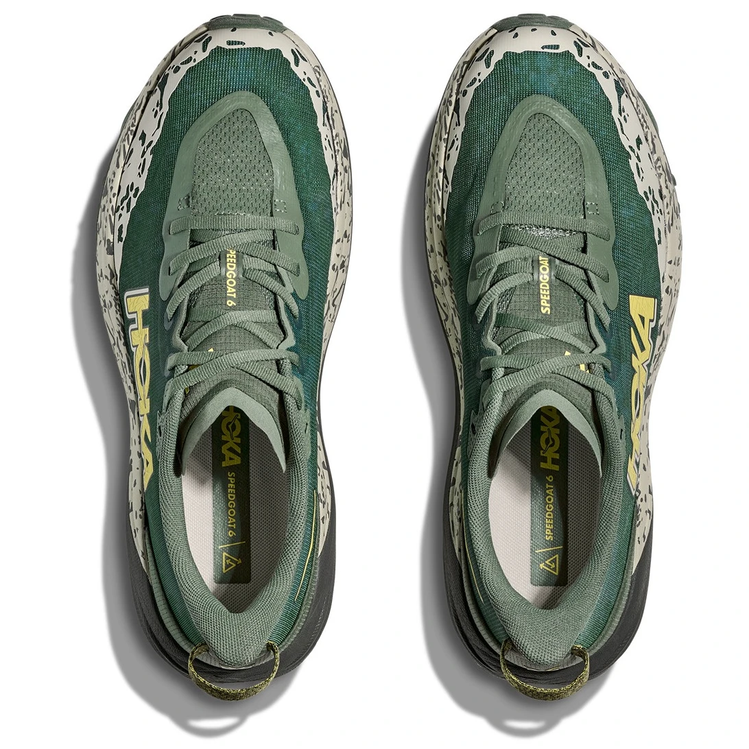 A Hoka Speedgoat 6 Wide futócipőjét technikai pályákra tervezték. A 6. generáció alacsony súllyal és nagyszerű tapadással tér vissza. Ez a cipő a talpától a fűzőig Vibram® Megagrip középtalppal és Traction Luggal rendelkezik, amely a laza talajon való jobb tapadást biztosítja. A Speedgoat Wide 6 megtartotta ugyanazt a talpmagasságot és rocker-formát (külső talp görbülete), de könnyebb középtalp-keveréket és egy erősebb, kétrétegű jacquard hálót használ, amely bármilyen terepen bizalmat ébreszt.