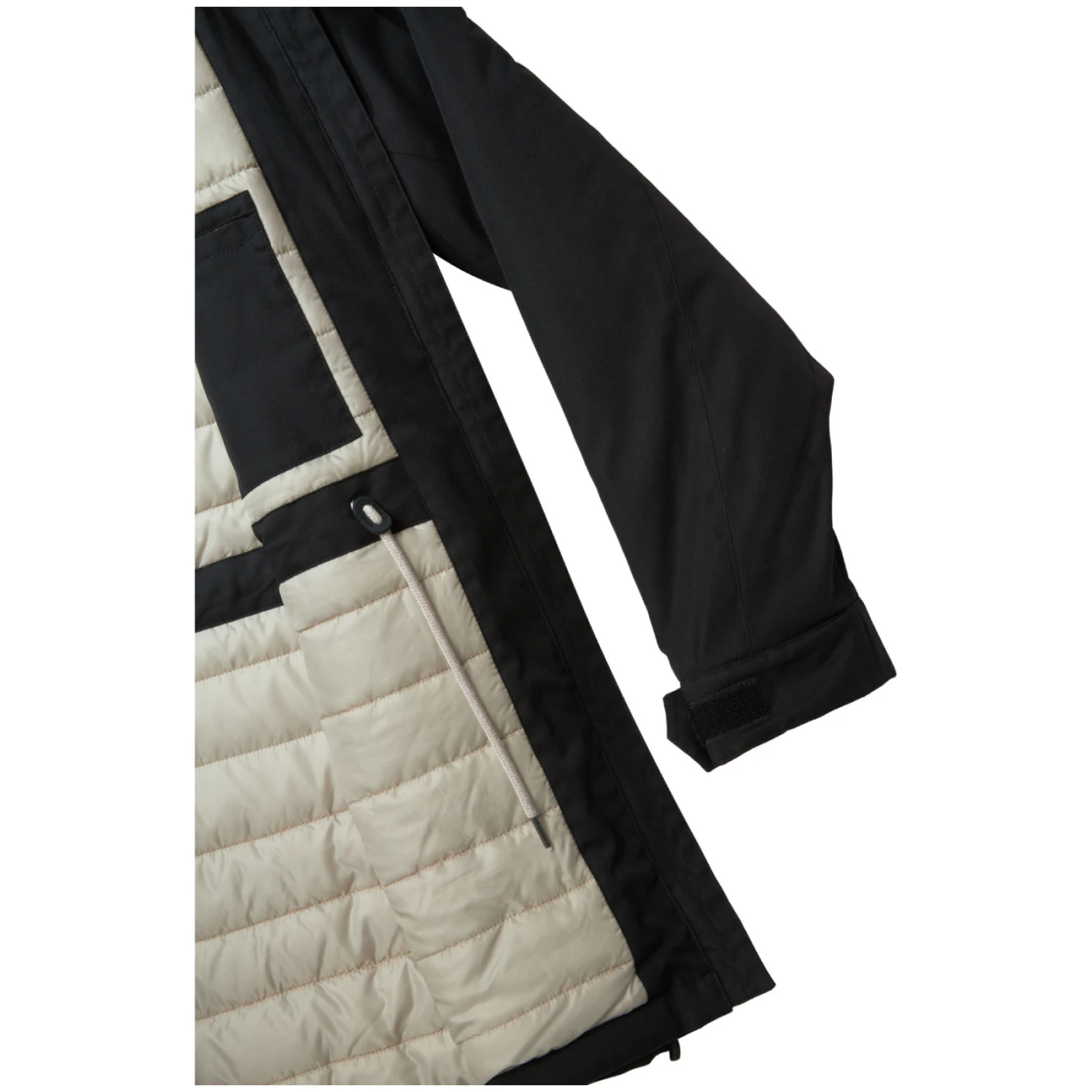 A kabát klasszikus szabása a húzózsinórral ellátott derékrészen lehetővé teszi, hogy a stílusához igazítsa, míg az ujjak tépőzárral könnyen beállíthatók. A rögzített, állítható kapucniés a kétirányú, fémes hatású csontcipzár modern megjelenést kölcsönöz a kabátnak, és növeli a funkcionalitását.