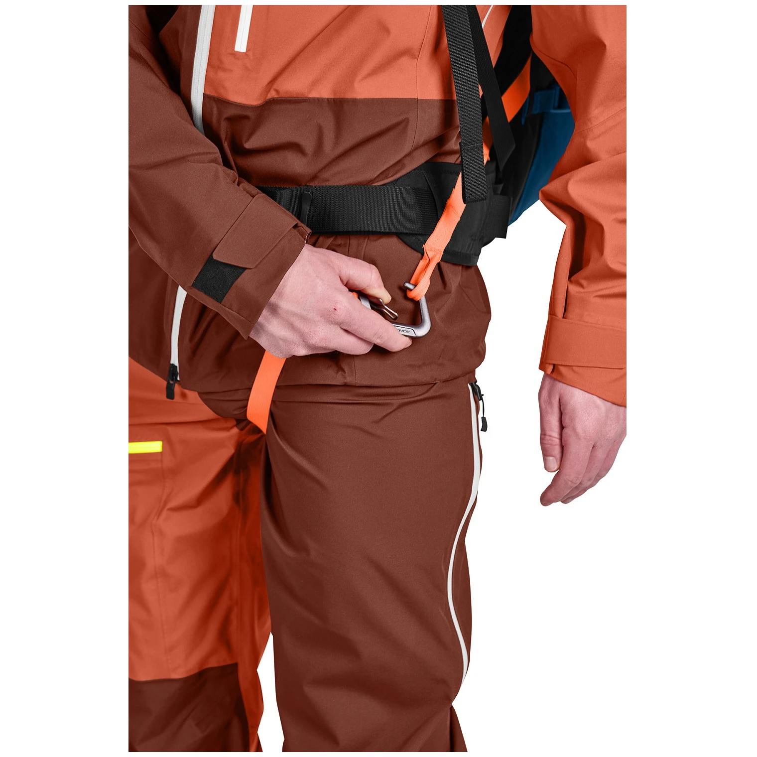 A lábak közötti reteszelő heveder élénk narancssárga színű, így leereszkedés előtt gyorsan és egyértelműen ellenőrizhető a helyes reteszelés. A heveder célja, hogy megakadályozza, hogy a hátizsákot egy mozgó lavina lerántsa a testről. A derékszíjon lévő csattos csatt így jelentősen növeli a felhasználói kényelmet, különösen akkor, ha a kötélpályára való felszállás előtt gyorsan lecsatolja a nadrágot.