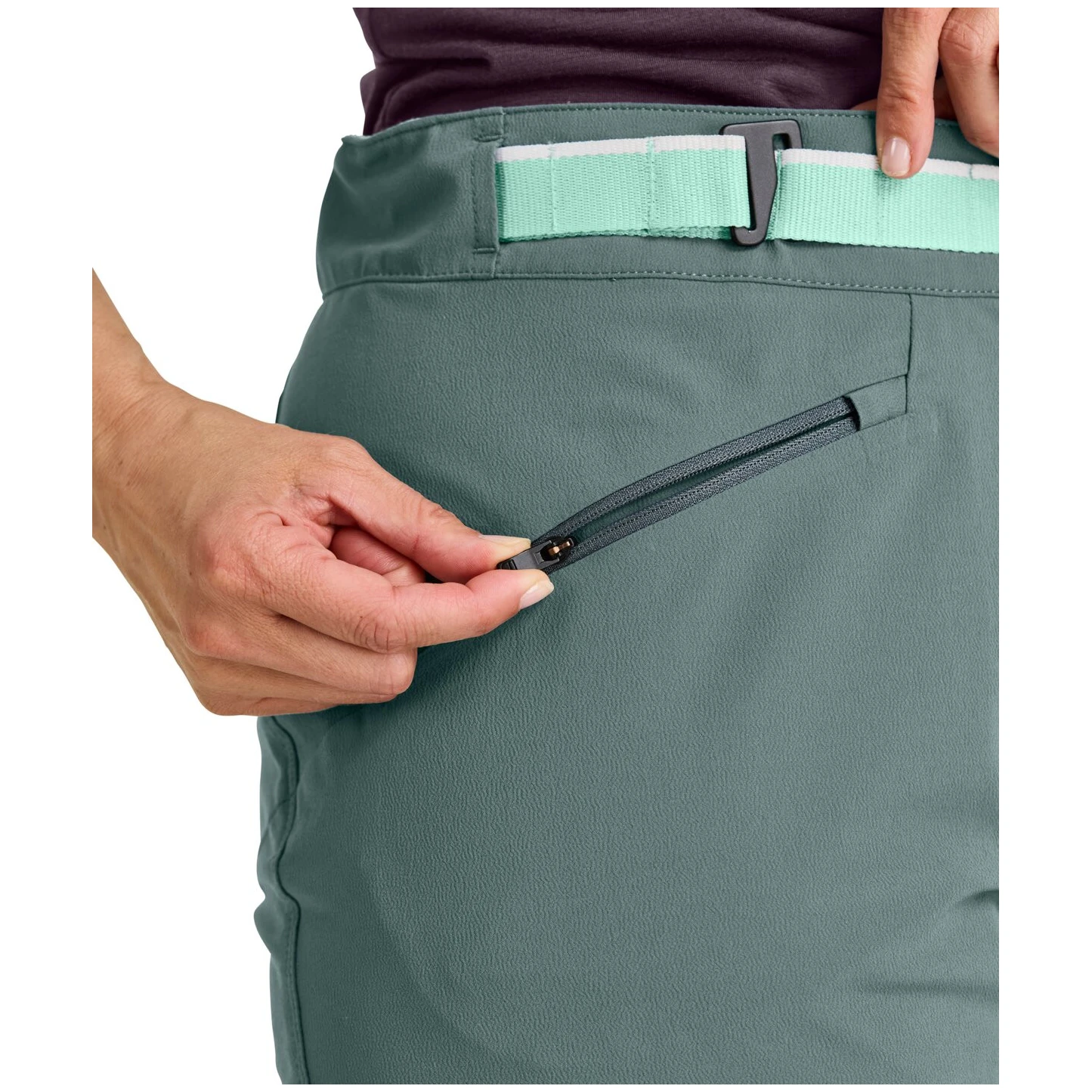 A nadrág állítható, magasabb derékrésszel rendelkezik, a fokozott kényelem érdekében a derékpánt belső oldalán MERINO MESH betétek találhatóak. A nadrág beépített övvel, 2 cipzáras elülső zsebbel és 1 cipzáras combzsebbel ellátott. A lábszár szegélye beállítható, a nadrág szabása kényelmes.