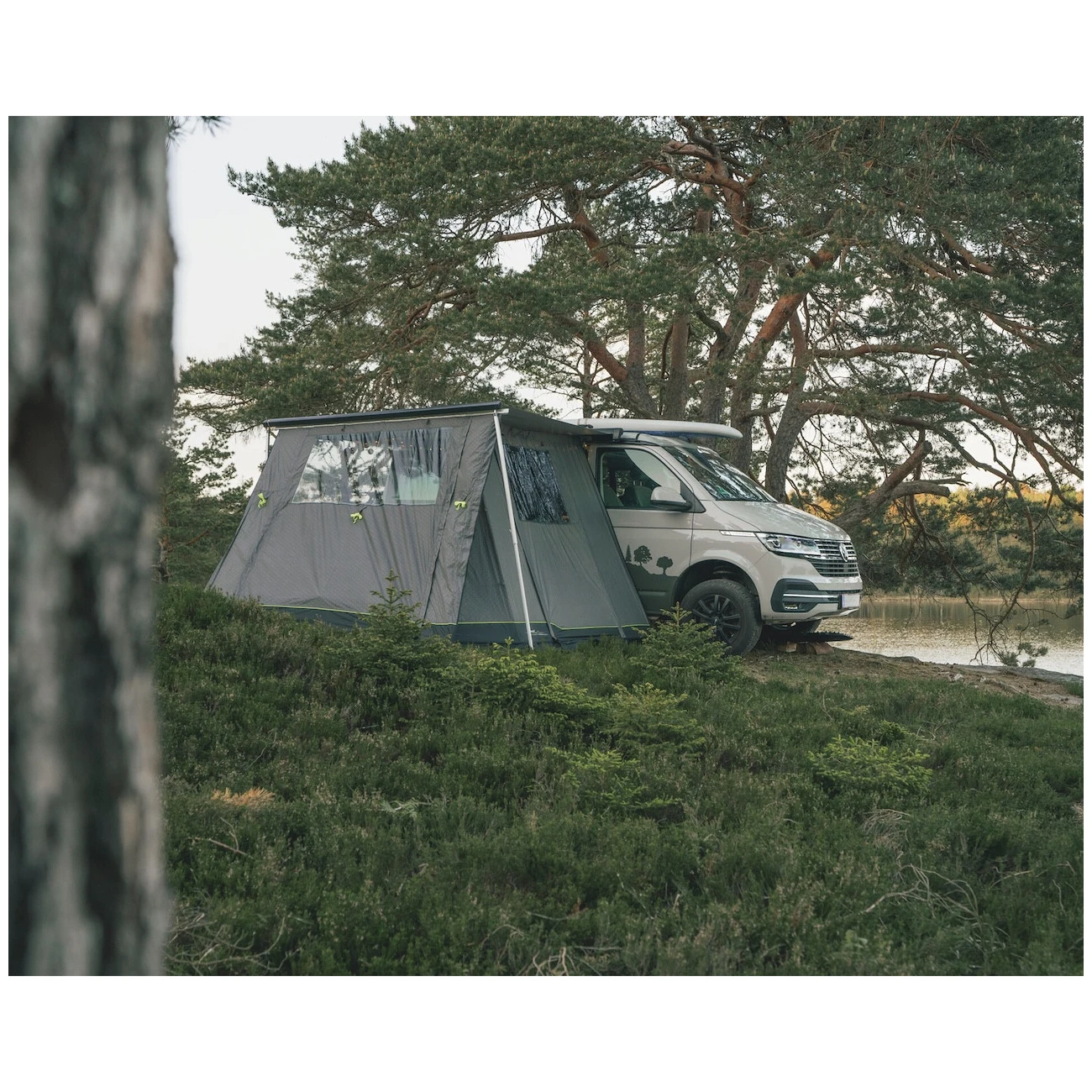 A tetőelőteret közvetlenül a napellenzőhöz rögzítheted az 5 és 7 mm széles kéder sínek segítségével. Az árnyékoló palástja vízálló Outtex® 4000 Select anyagból készült, amely rossz időjárás esetén is védelmet nyújt. Az oldalfalak nagy, színezett ablakokkal rendelkeznek, amelyek elegendő fényt biztosítanak az előtető belsejében, ugyanakkor a függönyöknek köszönhetően magánéletet is biztosítanak. Az előre rögzített fényvisszaverő rögzítőkötelek rossz idő esetén is a helyükön tartják a ponyvát. Az előtető könnyen összecsomagolható, és kényelmesen elfér a California hátsó ajtajában.
