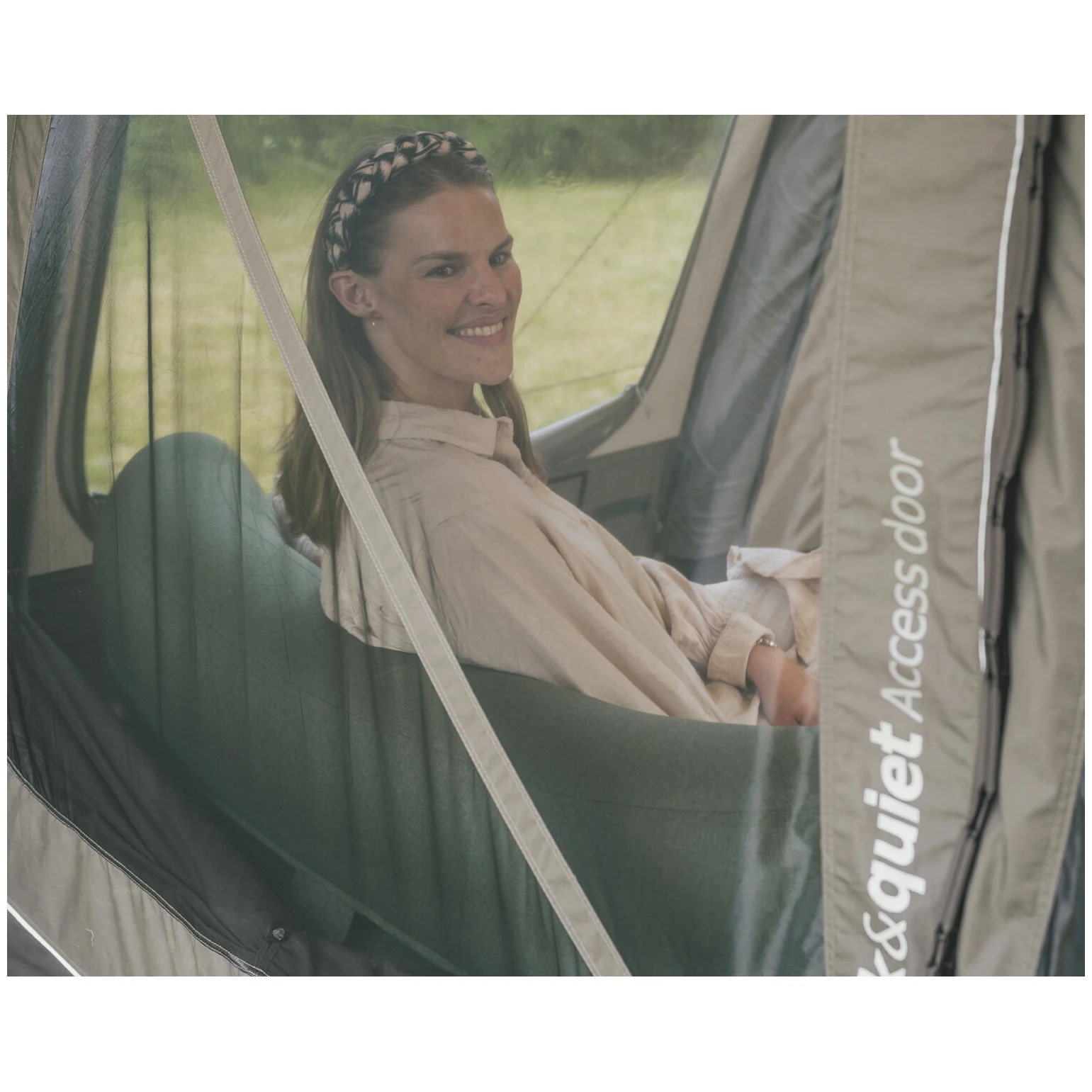 A sátor első része az előtető.Ezt követi az előtér, ahová akadálymentes bejáraton keresztül juthat be. A tágas előszobában világos tető és széles, tónusú ablakok vannak, így elegendő fény van benne, ugyanakkor véd a közvetlen napfénytől és UV-sugárzástól. Az ablakok cipzáras függönyökkel vannak ellátva a nagyobb magánélet érdekében. Az oldalsó bejárat egy kis előtetőhöz vezet.