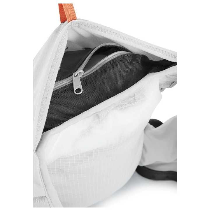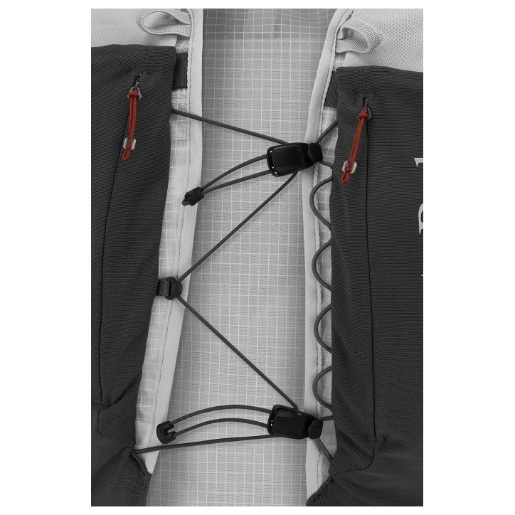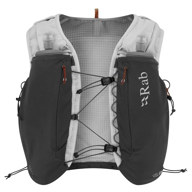 A Rab Veil 12 futómellény könnyű szerkezettel rendelkezik, légáteresztő hálóval, valamint rengeteg zsebbel, ahol minden futáshoz szükséges kellék tárolható. A mellény kompatibilis a víztasakkal (nem tartozék), és 2 könnyű, 500 ml-es palackot tartalmaz.