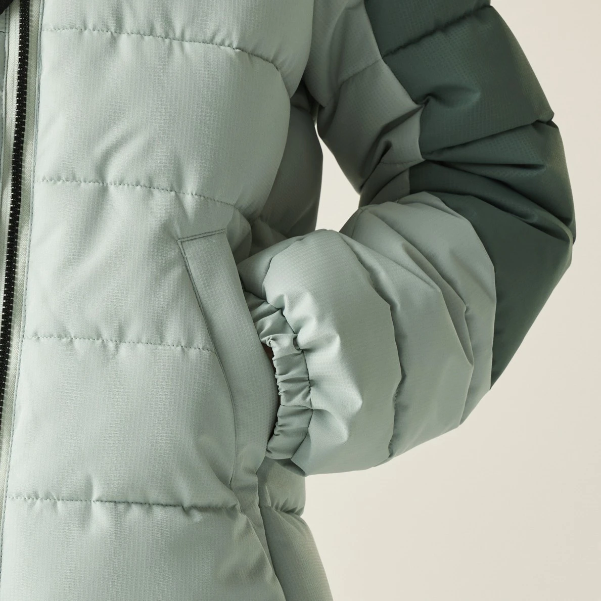 Tartós poliészter szövött anyagból készült, erős vízlepergető bevonattal, amely véd a szél ellen is, ugyanakkor légáteresztő marad. Belül közepes szintetikus szigetelés rejtőzik, amely könnyű és megbízhatóan melegen tart. A beállítható kapucni, a magas gallér, a rugalmas passzék az ujjakon és az állítható alsó szegély megakadályozzák a hideg bejutását. Természetesen két alsó cipzáras zseb és egy cipzáras mellkaszseb is található rajta.