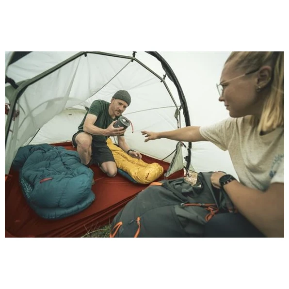 A minden időjárásban megbízható védelmet a szilikonozott HydroTex SiliPoly RS külső borítás biztosítja, amely nedvesség hatására sem ereszkedik meg. Ez az anyag 2000 mm vízállóságot biztosít, és a ripstop-nak köszönhetően ellenáll a mechanikai sérüléseknek. A hálószoba légáteresztő nejlonból készült, a padló pedig ripstop nejlonból, poliuretán bevonattal és 5000 mm-es vízállósággal. Az aláragasztott varratok magától értetődőek. Az anyagok nem tartalmaznak PFAS- vegyületeket.