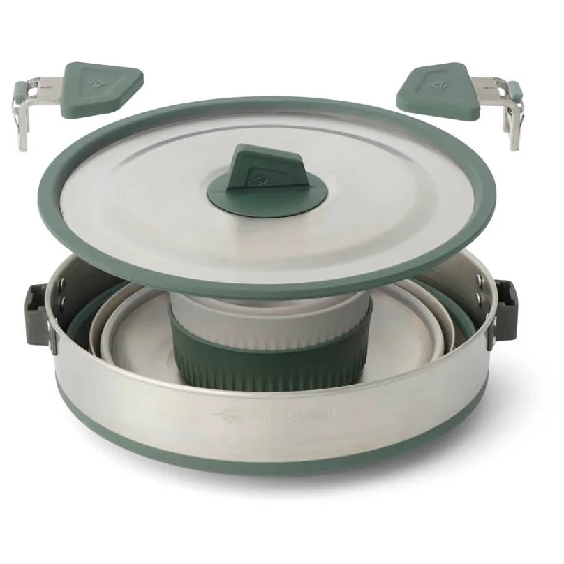 A Sea to Summit Detour Stainless Steel One Pot Cook Set 5 Piece strapabíró és könnyen csomagolható főzőkészlet két fő részére biztosít étkezési lehetőséget, BPA-mentes kivitelben. A készlet tartalmaz egy hőálló 3 literes Detour fazekat dupla fogantyúval a tökéletes kiöntésért, valamint két nagy tálat és két bögrét két kempingező számára. A főzőedények kompakt mérete értékes helyet takarít meg a tábori konyhában. A háromrétegű edényfenékkel pedig mind a gáz-, mind az indukciós főzőlapokon ellenőrizni tudja az ételeket .