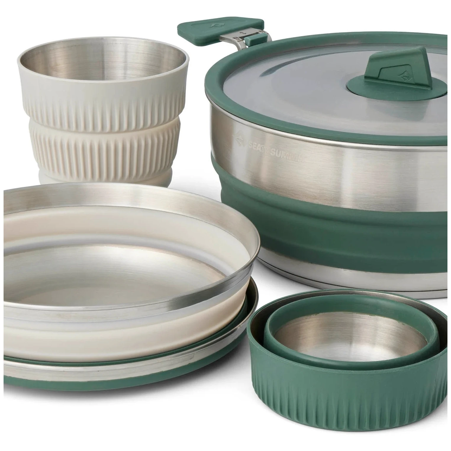 A Sea to Summit Detour Stainless Steel One Pot Cook Set 5 Piece összecsukható edényszett tartalmaz egy 3 literes lábast, 2 tálat és 2 bögrét. Ideális felszerelés két túrázó számára.