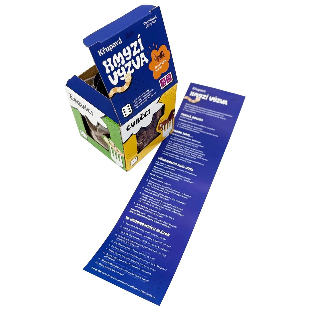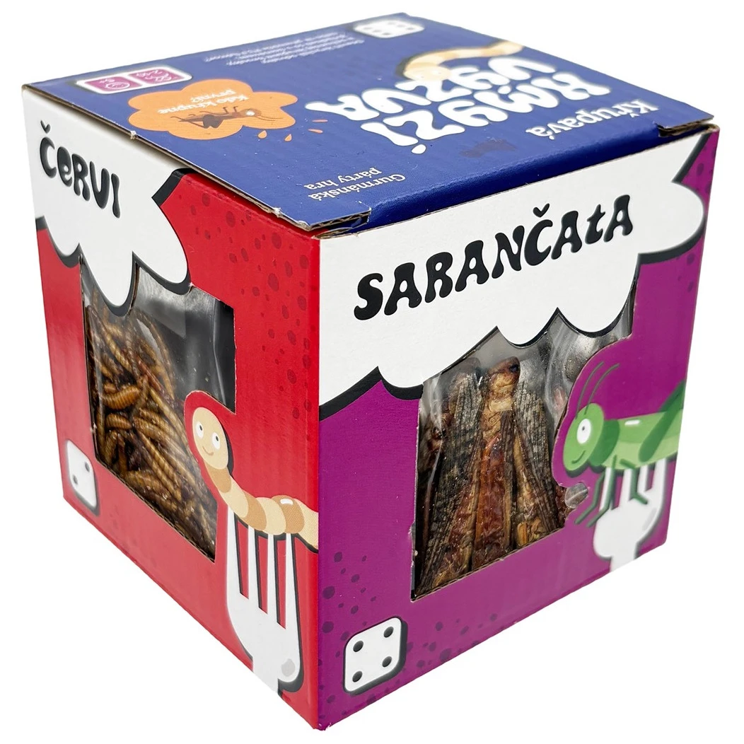 Szórakoztató partijáték ehető rovarokkal a Sens-től. Dobj, szórakozz és kóstold meg a tücsköket, szöcskéket és kukacokat. Ideális vicces ajándéknak.