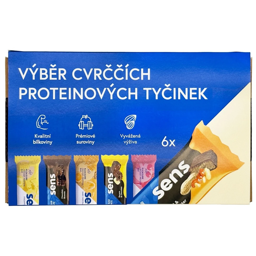 A Sens egy cseh márka, amely megpróbálja a tücsköket közönséges ételként elkészíteni. Kétféle szeletet kínál krikettliszttel. Az energiabár gyümölcsöt, rostot és fehérjét tartalmazó, kiegyensúlyozott snack. Különösen nehéz munkanapon jön jól, amikor biztatásra van szükséged. Édes jóság, amit nem kell megbánni. A fehérjeszelet 20 g minőségi fehérjét, rengeteg egészséges zsírt és minimum szénhidrátot tartalmaz. Edzés után kiváló, segít az izomregenerálásban. Meg fog lepődni azon, hogy mennyire képes elűzni az éhséget, különösen, ha hiányzik az ebéd.