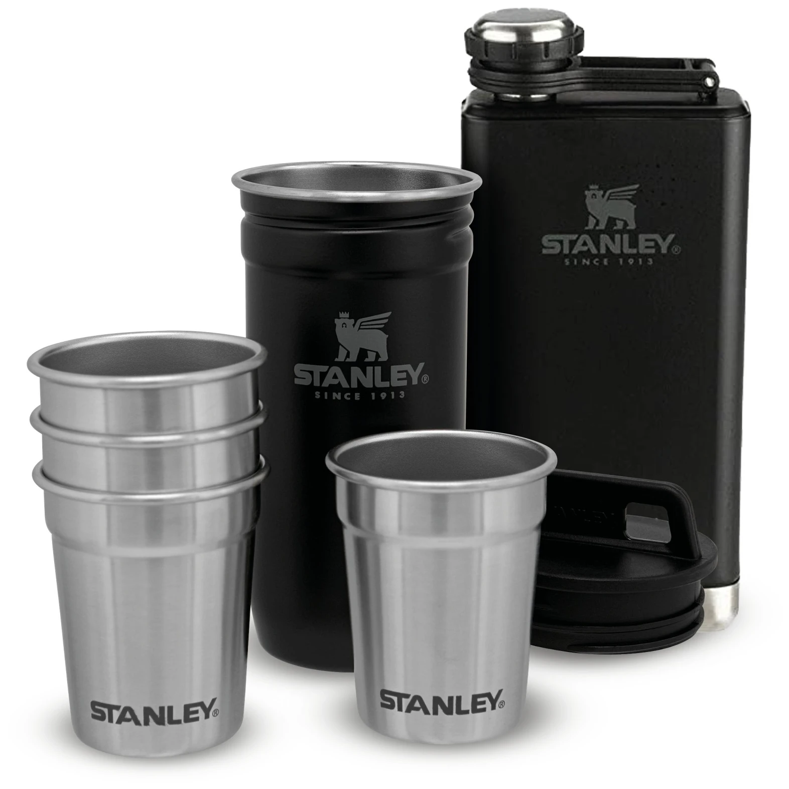 Stanley Adventure Series ajándék szett, amely egy laposüveget és 4 felespoharat tartalmaz, kiválóan alkalmas utazáshoz vagy vidéki kirándulásokhoz. A készlet 18/8 rozsdamentes acélból készült, a tartozékok műanyagból készültek, de nyomokban sem tartalmaznak BPA-t. A laposüveg beépített zárószerkezettel rendelkezik, így nem kell aggódnia a kupak elvesztése miatt. A kupak műanyagból készült, szilikon tömítéssel ellátott. A könnyebb kezelhetőség és a kényelmes kiöntés érdekében a laposüveg nyaka szélesebb. A készlet minden része mosogatógépben mosható.