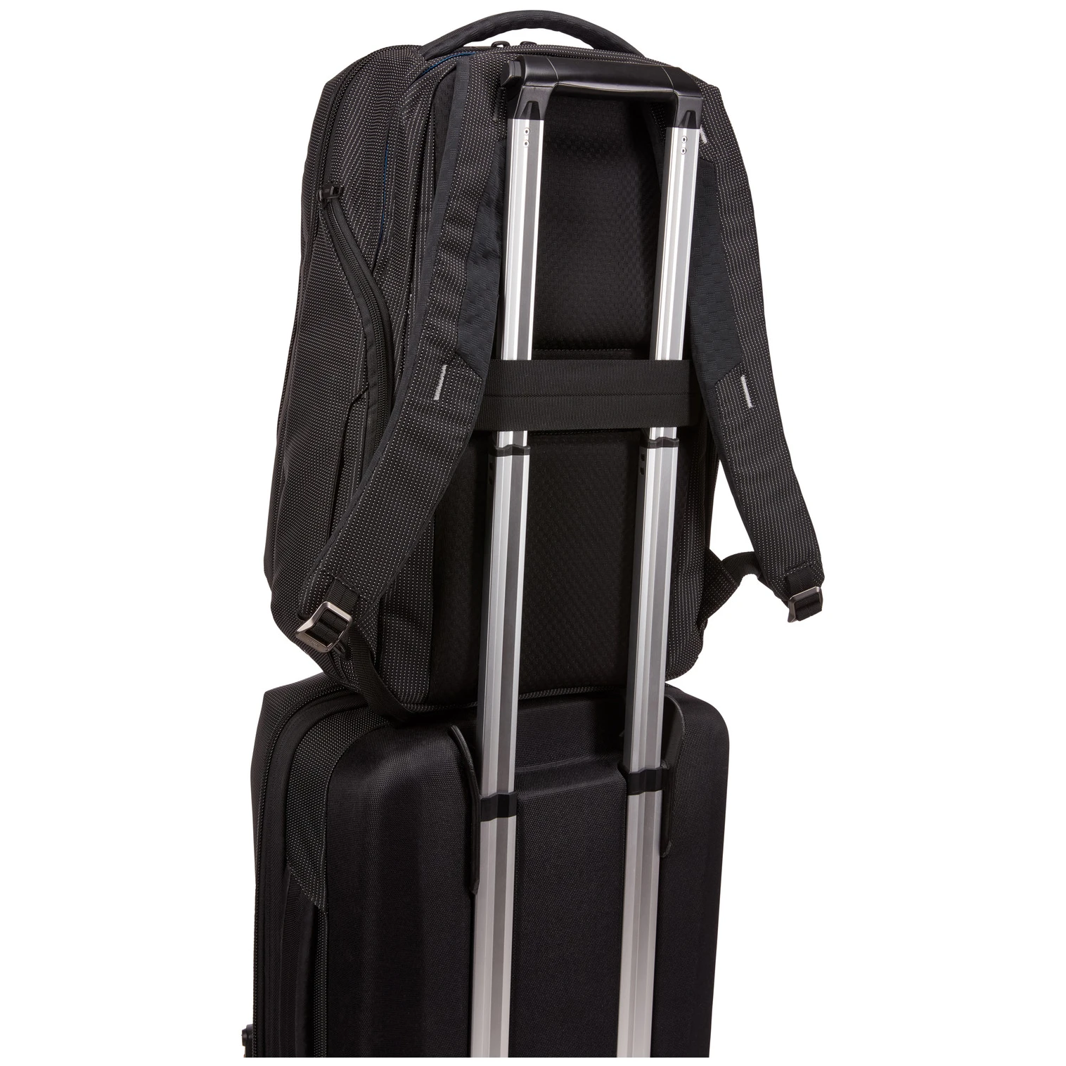 - a hátizsák biztonságos rögzítése a kerekes bőröndre a beépített, nyílással ellátott pánt segítségével