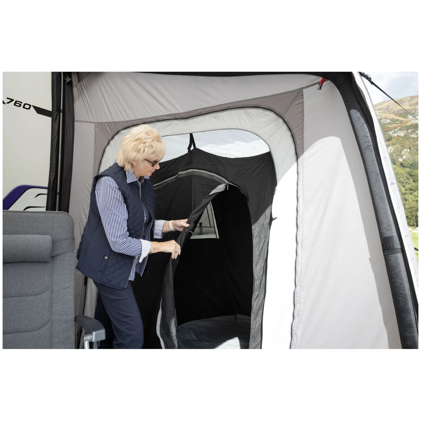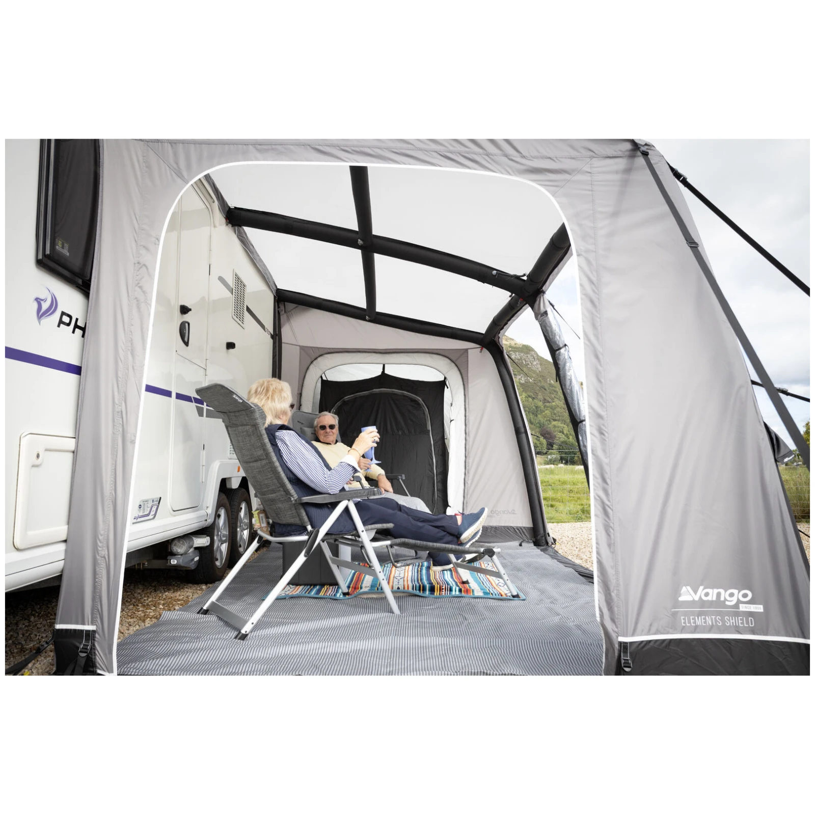 A nagy Diamond Clear panorámaablakok kiváló kilátást biztosítanak a környezetre és elegendő nappali fényt engednek be, míg a cipzáras függönyök lehetővé teszik a magánszféra egyszerű szabályozását. Az ergonómiailag formázott és előre hajlított tartók növelik a belső teret és a stabilitást még szelesebb körülmények között is. A maximális kényelem érdekében a csomag tartalmaz egy szélvédő szoknyát és kerékdob takarókat is, amelyek megakadályozzák a hideg behatolását.