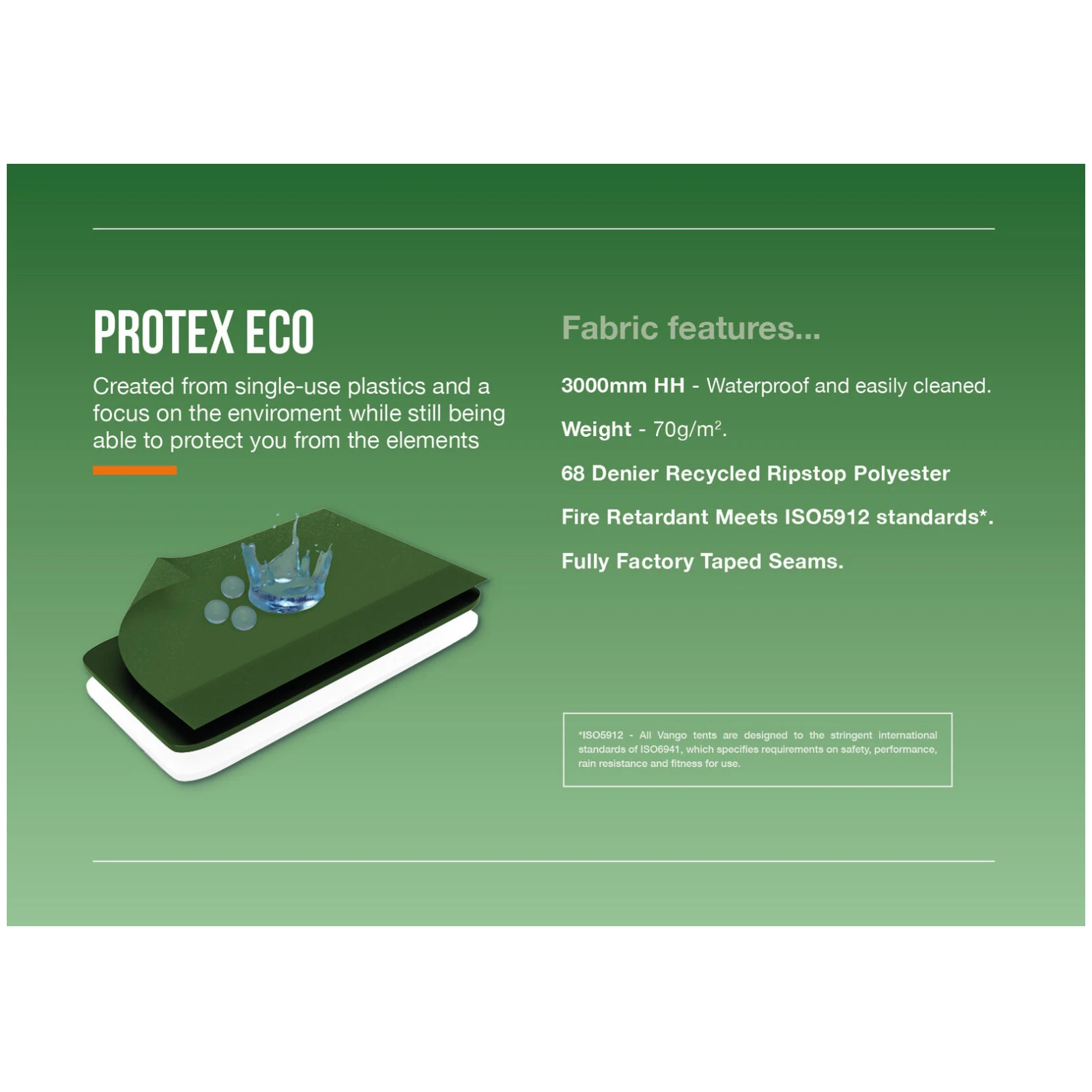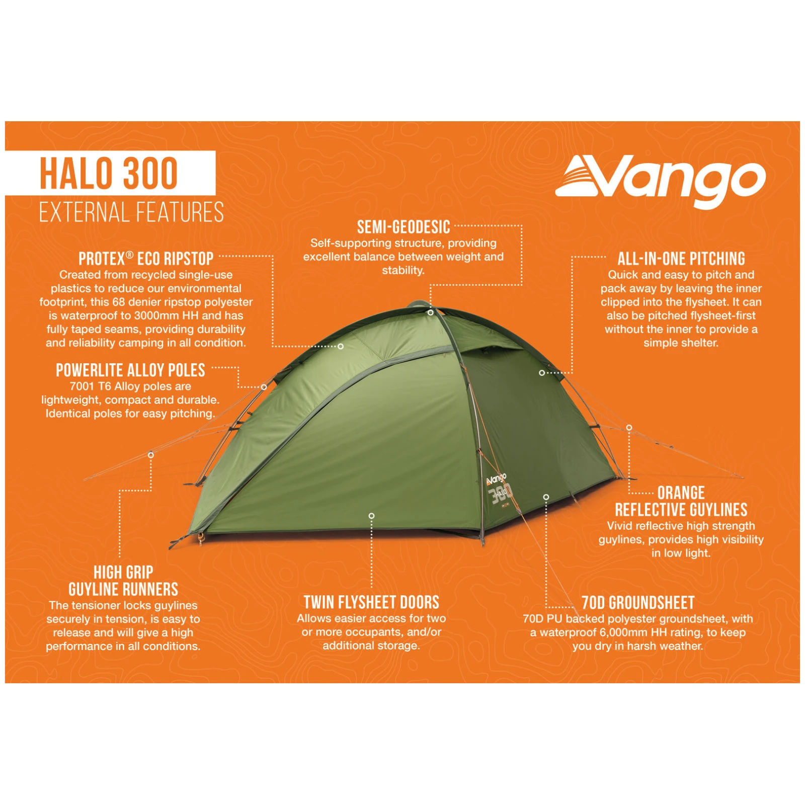 A Vango Halo Pro 300 sátor egy félgeodéziai, háromszemélyes sátor, amely ideális egyensúlyt kínál az alacsony súly, a szilárdság és a belső kényelem között. A három azonos PowerLite rúdnak köszönhetően, amelyek 7001-T6 alumíniumötvözetből készültek, egy önállóan álló szerkezet jön létre, amely nagyon stabil, könnyen felállítható, és jól ellenáll a szélnek és a kedvezőtlen időjárásnak. A Protex Eco Ripstop külső ponyva újrahasznosított műanyagokból készült, 3 000 mm vízállósággal és teljesen ragasztott varrásokkal.