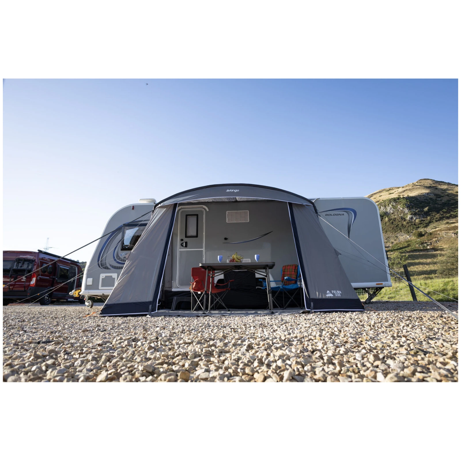 A Vango Palma 330 modell egy könnyű és praktikus turistafelszerelés lakókocsihoz, amelyet azoknak az utazóknak terveztek, akik megbízható hátteret keresnek hétvégi vagy rövidebb kirándulásokhoz. A körülbelül 2,4–2,5 m-es, kompakt mélységnek köszönhetően könnyen elfér a szűkebb helyeken is, anélkül, hogy kompromisszumot kellene kötni a belső tér vagy a kényelem terén.