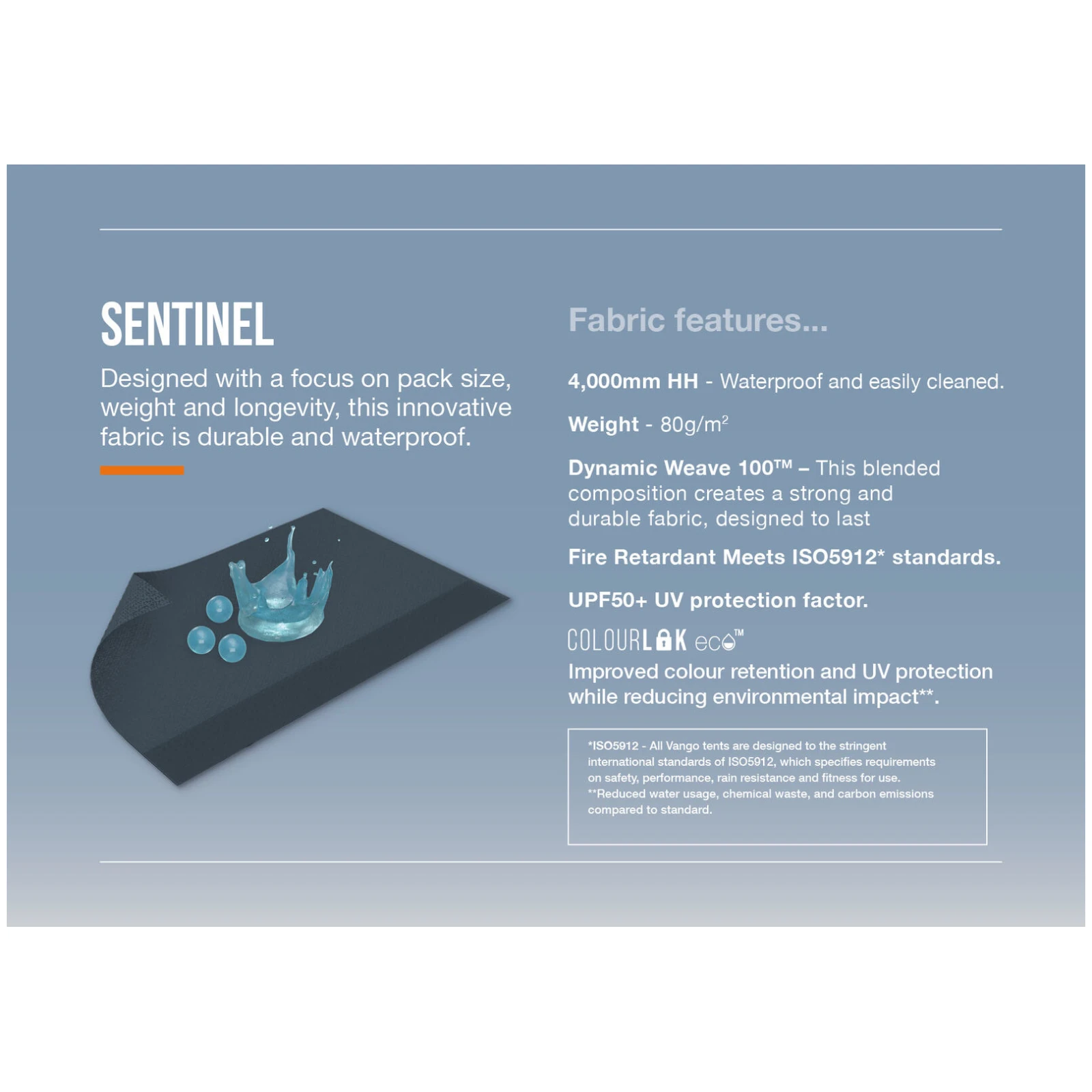 A Vango Sentinel oldalsó napellenzője ellenálló Dynamic Weave 100™ szövetből készült, 4000 mm HH vízállósággal, amely kiváló szilárdságot, súlyt és kompakt méretet kínál összecsomagolva. A ColourLok technológiának köszönhetően az anyag hosszú ideig megőrzi színét és funkcionális tulajdonságait. A szerkezet PowerFlex® üvegszálas rudakból áll, amelyek könnyűek, erősek és megbízhatóak még szelesebb időben is.