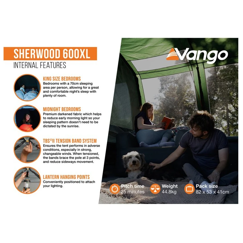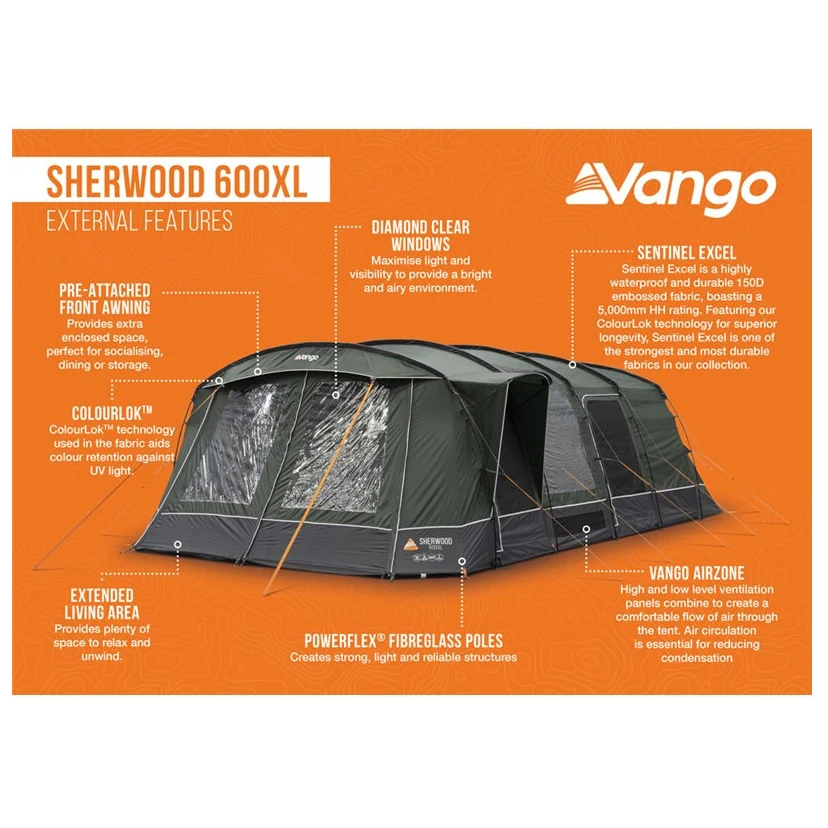 A Vango Sherwood 600XL Package sátor ideális családi kempingezéshez akár 6 fő részére. Kialakításában PowerFlex® üvegszálas rudakat használ, amelyek könnyűek, mégis erősek és tartósak. A dupla lakótér rengeteg helyet kínál a kényelmes ülőhelyeknek és a kempingfelszerelések tárolására. A nagy, kristálytiszta ablakok sok természetes fényt engednek be, míg a lehúzható függönyök biztosítják a magánéletet.