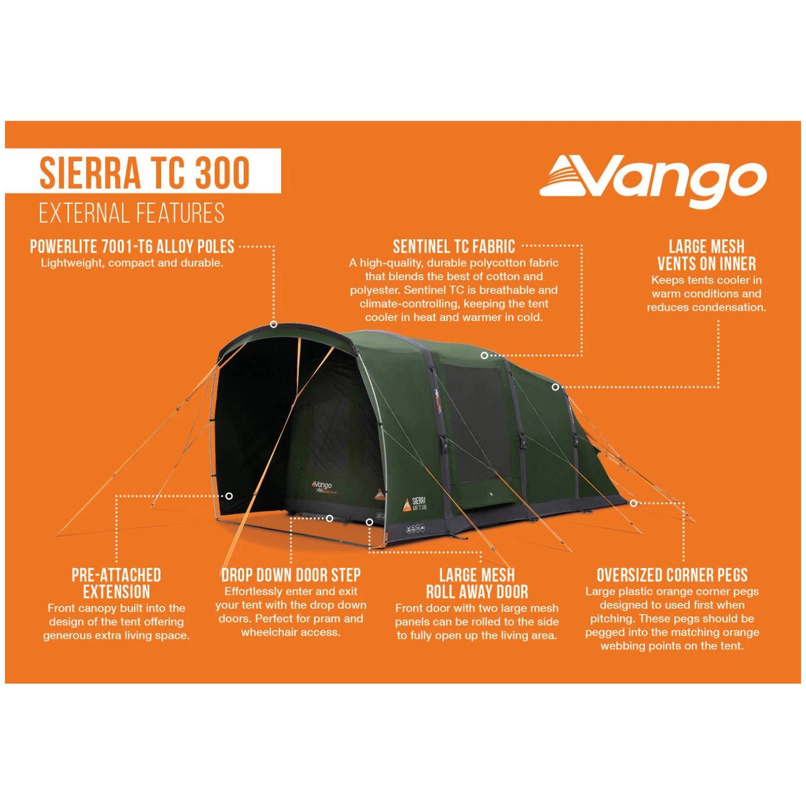 A Vango Sierra TC 300 egy kiváló minőségű, 3 személyes családi sátor, amely ötvözi a tágasságot, a kényelmet és a technológiát, hogy minden szabadtéri tartózkodása otthonos kényelmet idézzen. Ez a modell ideális párok számára, akik egy gyermekkel utaznak, vagy kis csoportoknak, akik maximális kényelmet, nagy életteret és kiváló klímiai tulajdonságokat szeretnének. A sátor prémium Sentinel TC szövetből készült, amely a pamut és a poliészter legjobb tulajdonságait ötvözi a természetes légkondicionálás és keringés érdekében.