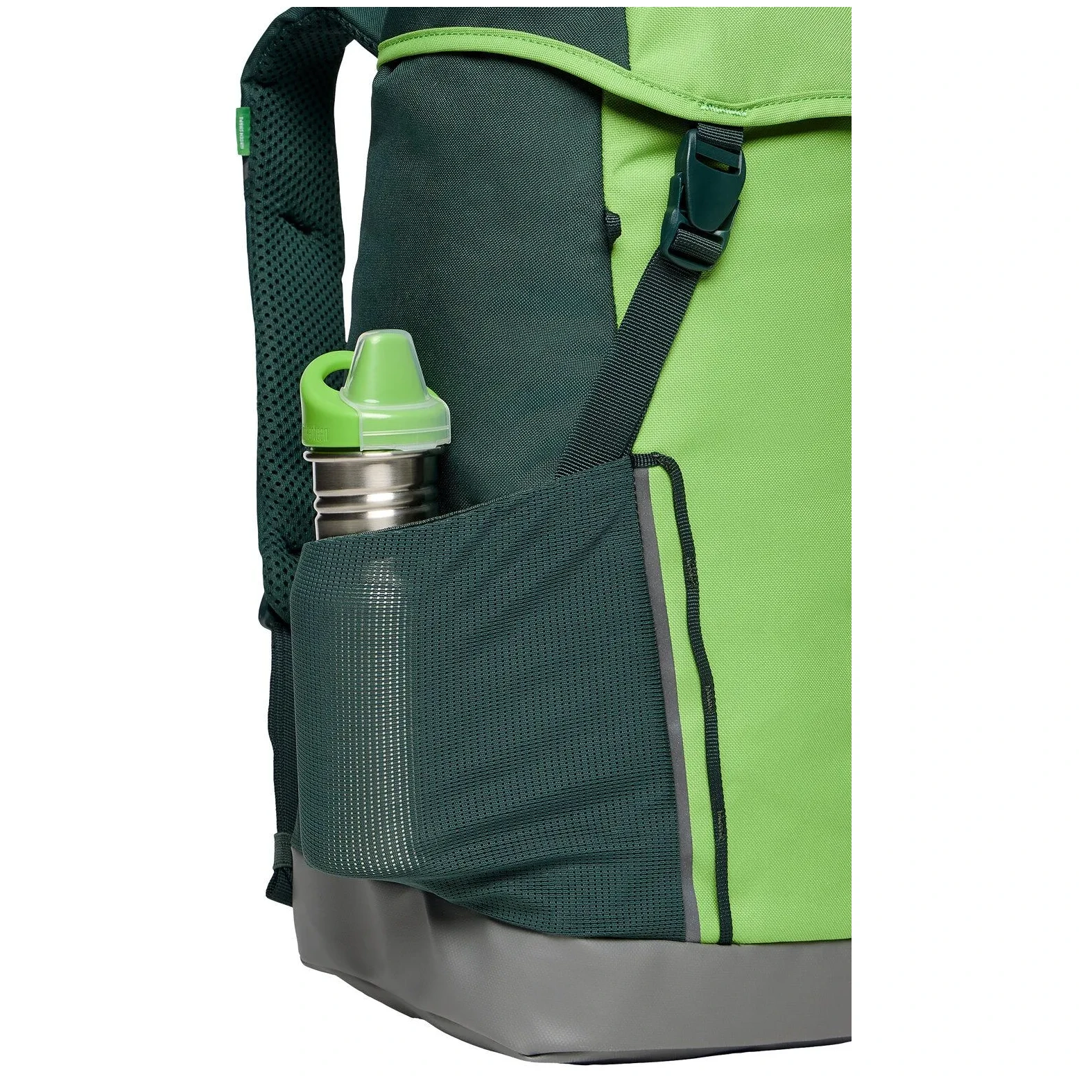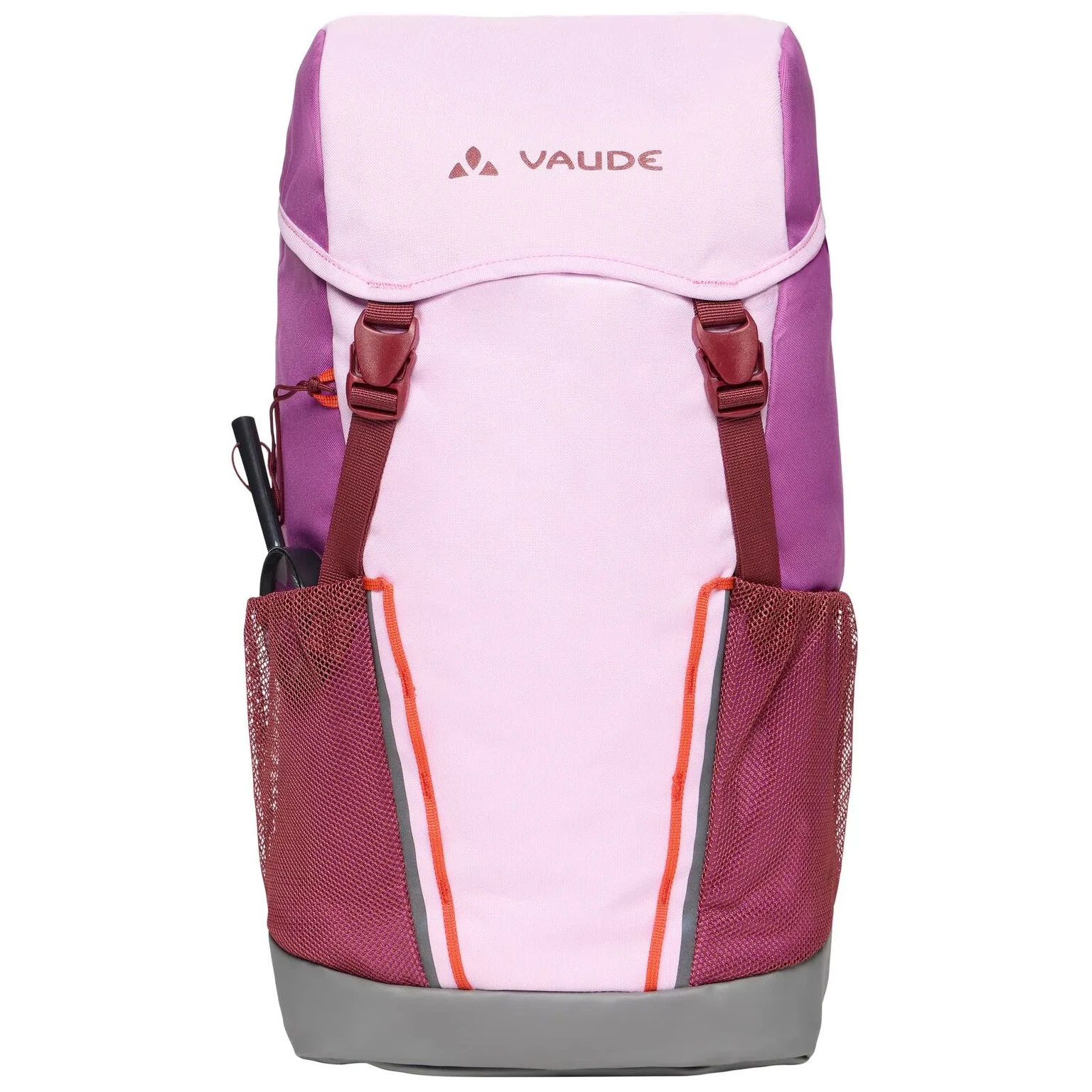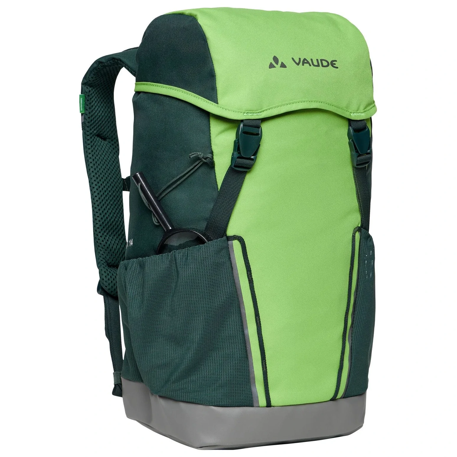 A Puck 14 kényelmes gyerek hátizsák a Vaude márkától ebben a verzióban még jobban igazodik a gyermekek igényeihez. Vízálló aljjal rendelkezik, ezért nem kell aggódni, ha a gyermek nedves felületre teszi le a hátizsákot. A felfüggesztési rendszer és az állítható mellkasi heveder biztosítja a legkényelmesebb használatot. A hátizsák része egy esőhuzat és párnázott üléspárna. A hátizsák két tágas külső hálós zsebbel rendelkezik, fényvisszaverő nyomattal és egy fedélen lévő zsebbel az apró tárgyak tárolására. A kis felfedezők örömére a Puck 14 hátizsák integrált nagyítóval is rendelkezik. A hátizsák újrahasznosított anyagból készült, környezetkímélő és vízálló Eco Finish anyaggal kiegészítve, fluor-karbonát (PFC) használata nélkül.