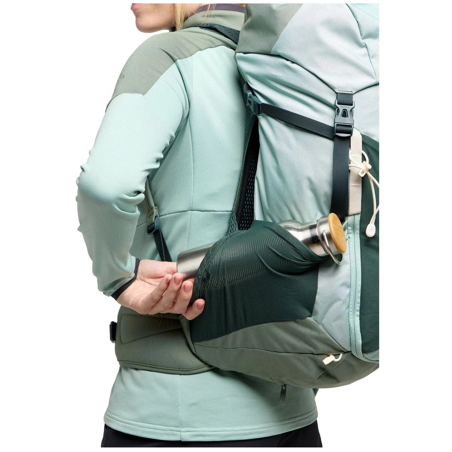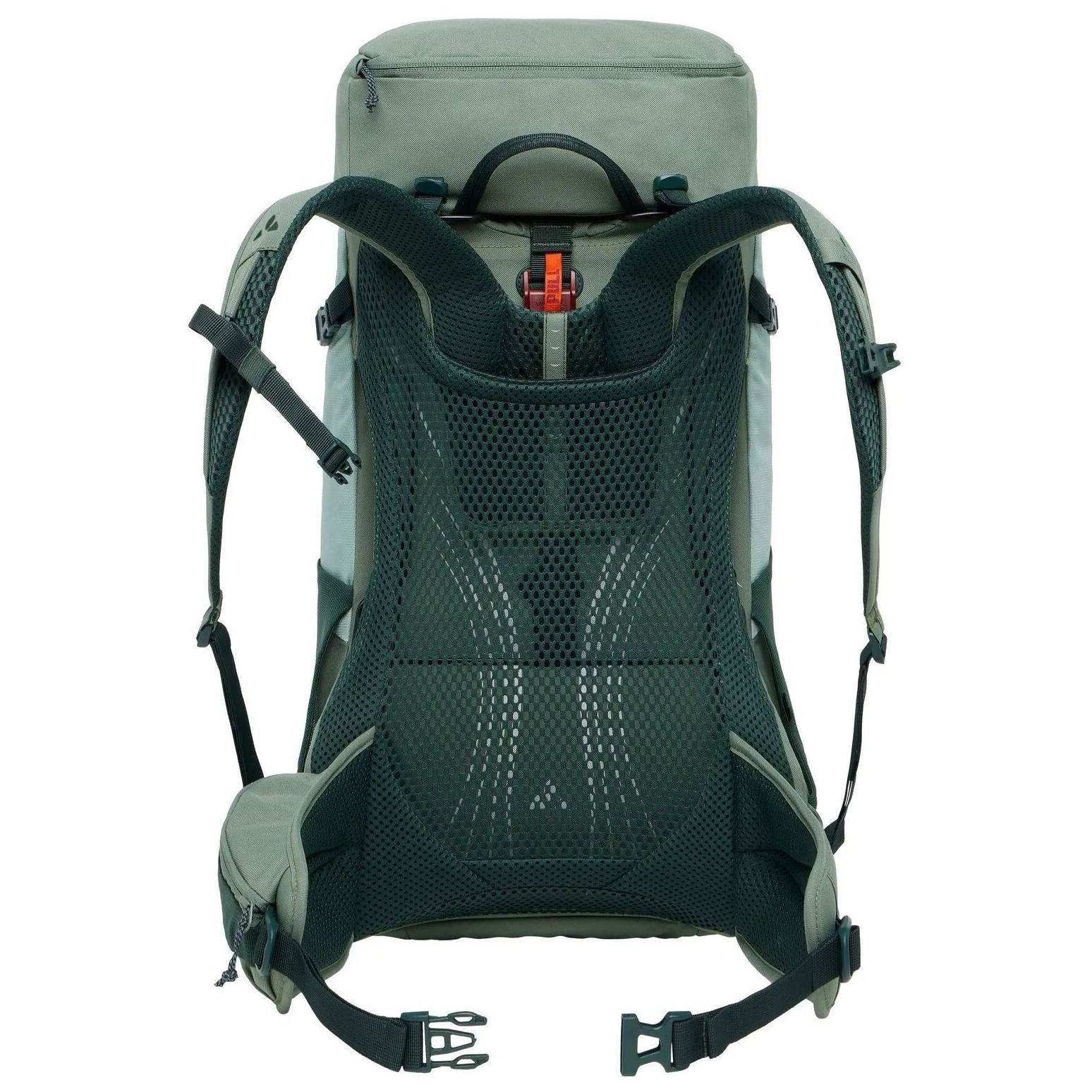 A praktikus funkciók közé tartozik a fő rekeszhez való elülső hozzáférés, az oldalsó sztreccs zsebek, a fedélzseb, az értéktartó rekesz, a túrabot tartó, a beépített levehető esővédő és a hidratálócső tartóval ellátott mellkaspánt. A külső anyag Eco Finish PFC-mentes kezelést kapott, újrahasznosított PET-ből készült, VAUDE Green Shape tanúsítvánnyal rendelkezik, ötvözve az ökológiát a magas funkcionalitással.