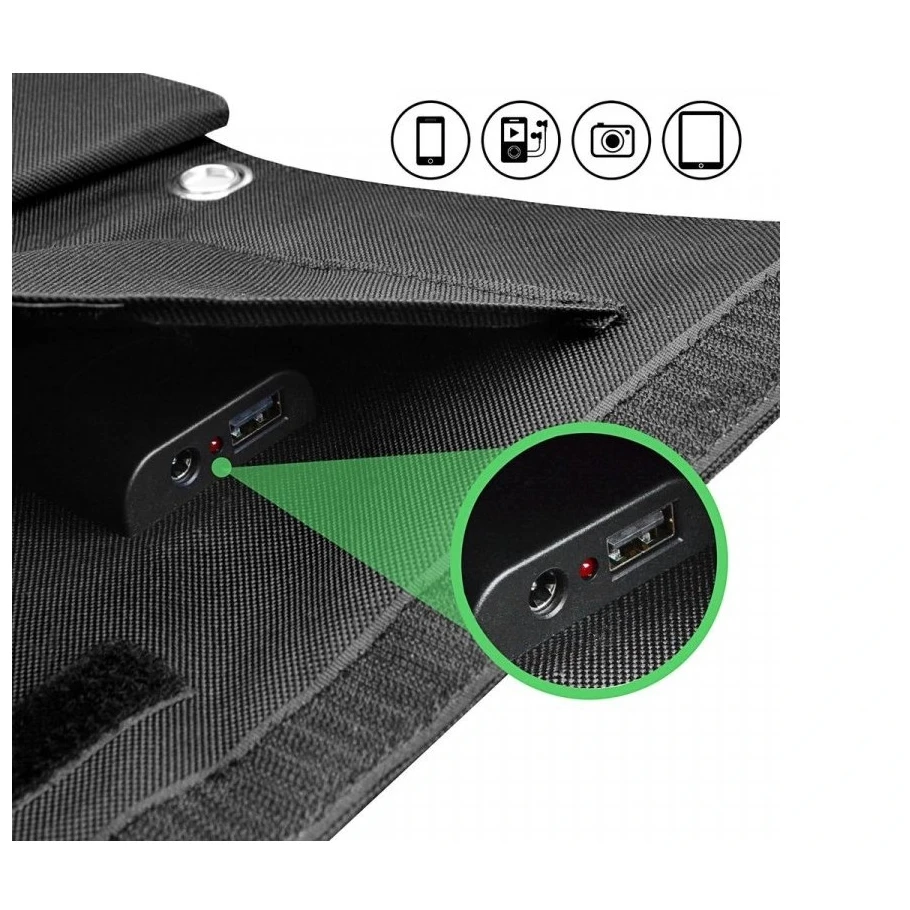 A panel vízálló poliészter tokkal, könnyű rögzítést biztosító fülekkel (hátizsák, kerékpár, sátor) és automatikus töltésindítás funkcióval van ellátva a készülék csatlakoztatása után. Az USB kimenetnek köszönhetően a legtöbb apró eszközt 5V/2,4A-ig, a DC kimeneten keresztül pedig akár 19V/1,5A-ig is táplálhatja az elektronikai eszközöket.