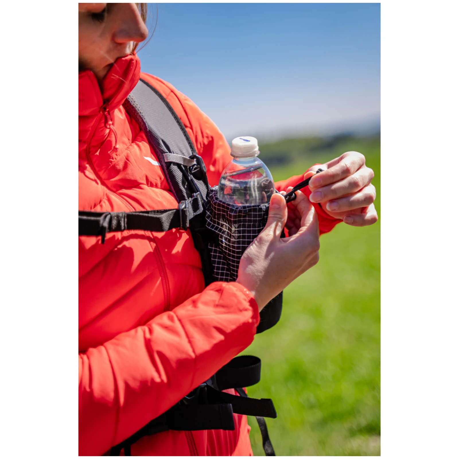 A zseb a hátoldalon található tépőzárak segítségével rögzíthető, amelyeknek köszönhetően kompatibilis a különböző típusú vállpántokkal. A stabilitást mozgás közben a felső műanyag csat is növeli, amely megakadályozza a lecsúszást. A palack a felső részen egy zsinórral rögzíthető, amely egy fékkel van ellátva, így biztosítva a szilárd és stabil tárolást.