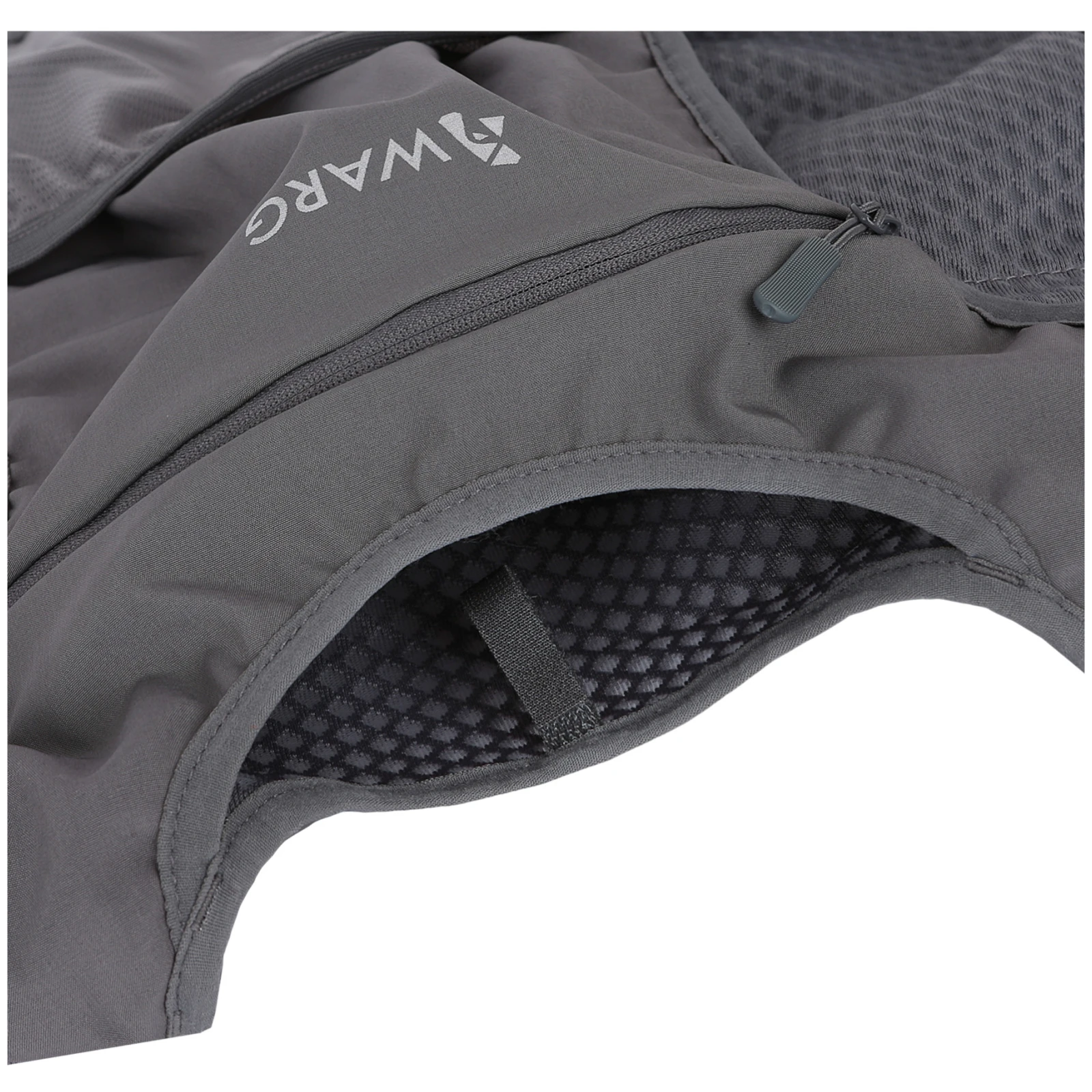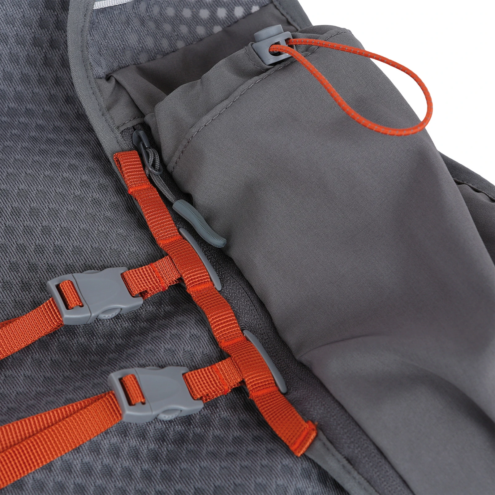 A hátsó részen két zseb található, melyek közül az egyik cipzáras az értéktárgyak biztonságos tárolására. Tartalmaz egy hidratációs zsák tartó részt is, amely lehetővé teszi a folyadékok kényelmes pótlását futás közben. Az elején két összehúzható mellkasi zseb található, ideális például puha kulacsokhoz vagy energiaszeletekhez, így minden fontos dolog könnyen elérhetővé válik anélkül, hogy meg kellene állni.